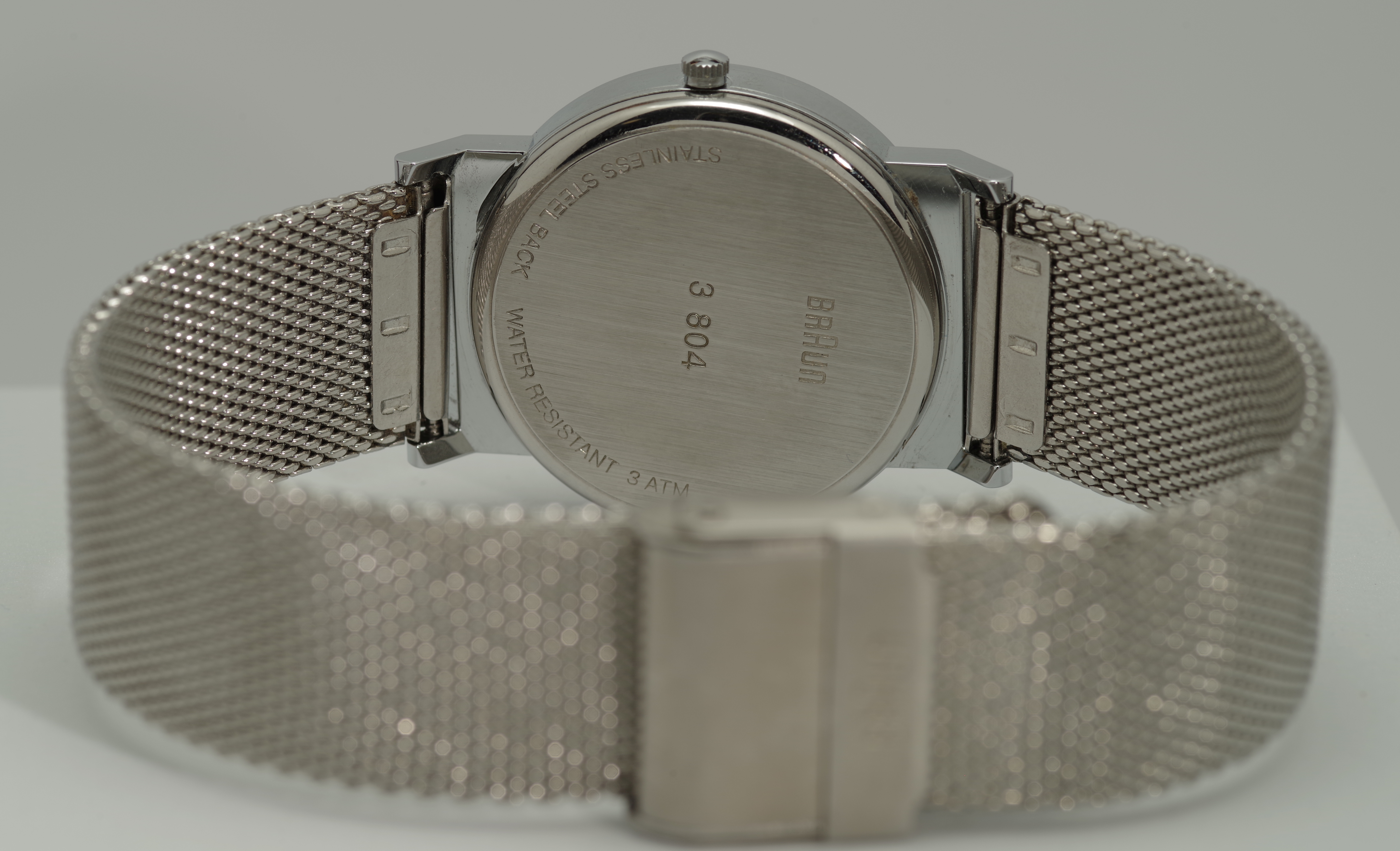 - Gehäuseboden: Edelstahl, verschraubt bzw. gepresst, mit Prägung "BRAUN", "Stainless Steel Back", Waterresistant 3 ATM" und der Referenznummer 3804.