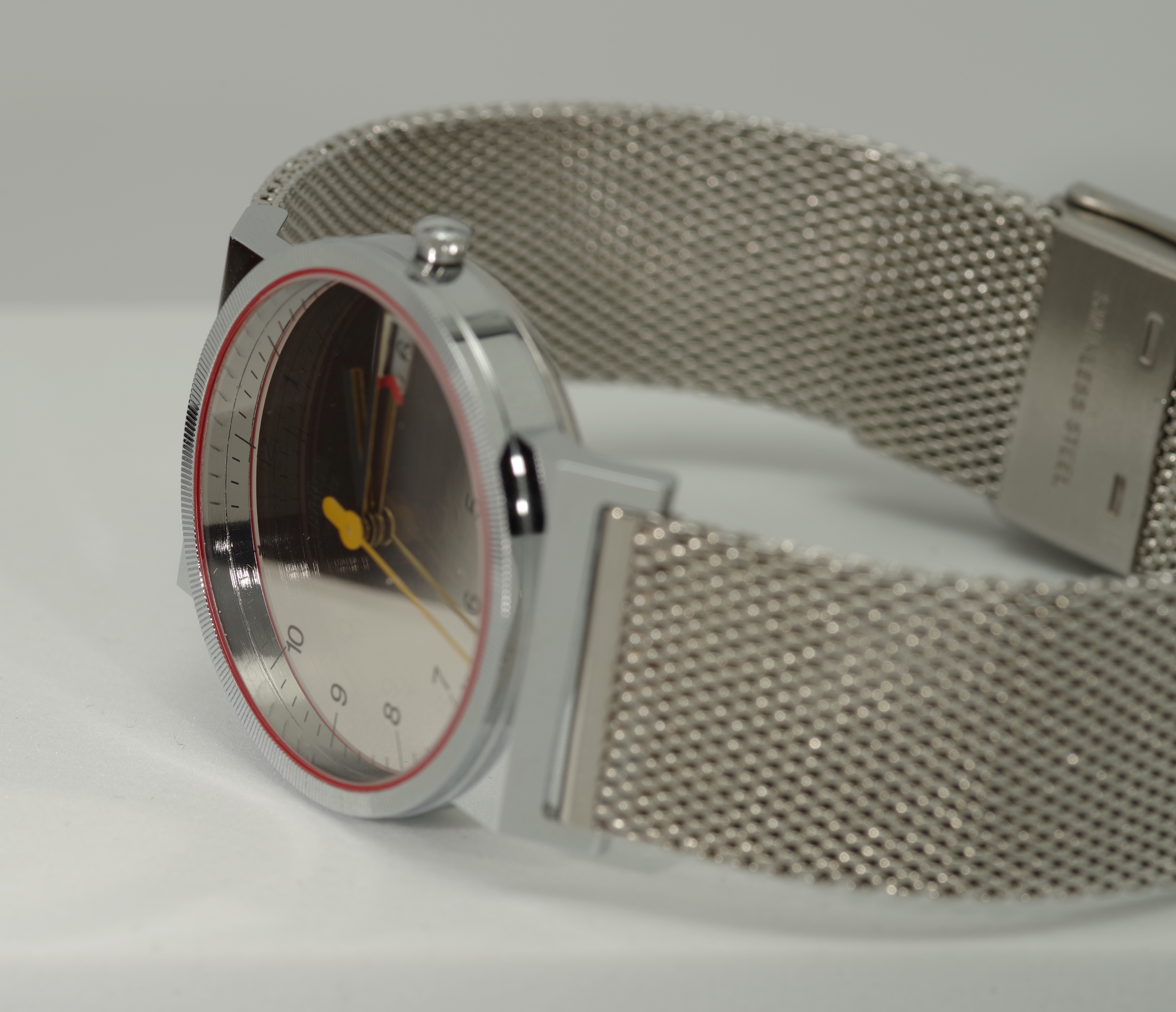 Als Band kamen ab Werk schlichte Lederbänder oder Mesh-/Milanaisebänder zum Einsatz, die den sachlichen, grafischen Eindruck der Uhr unterstreichen. Hier mit einem Milanaisearmband.