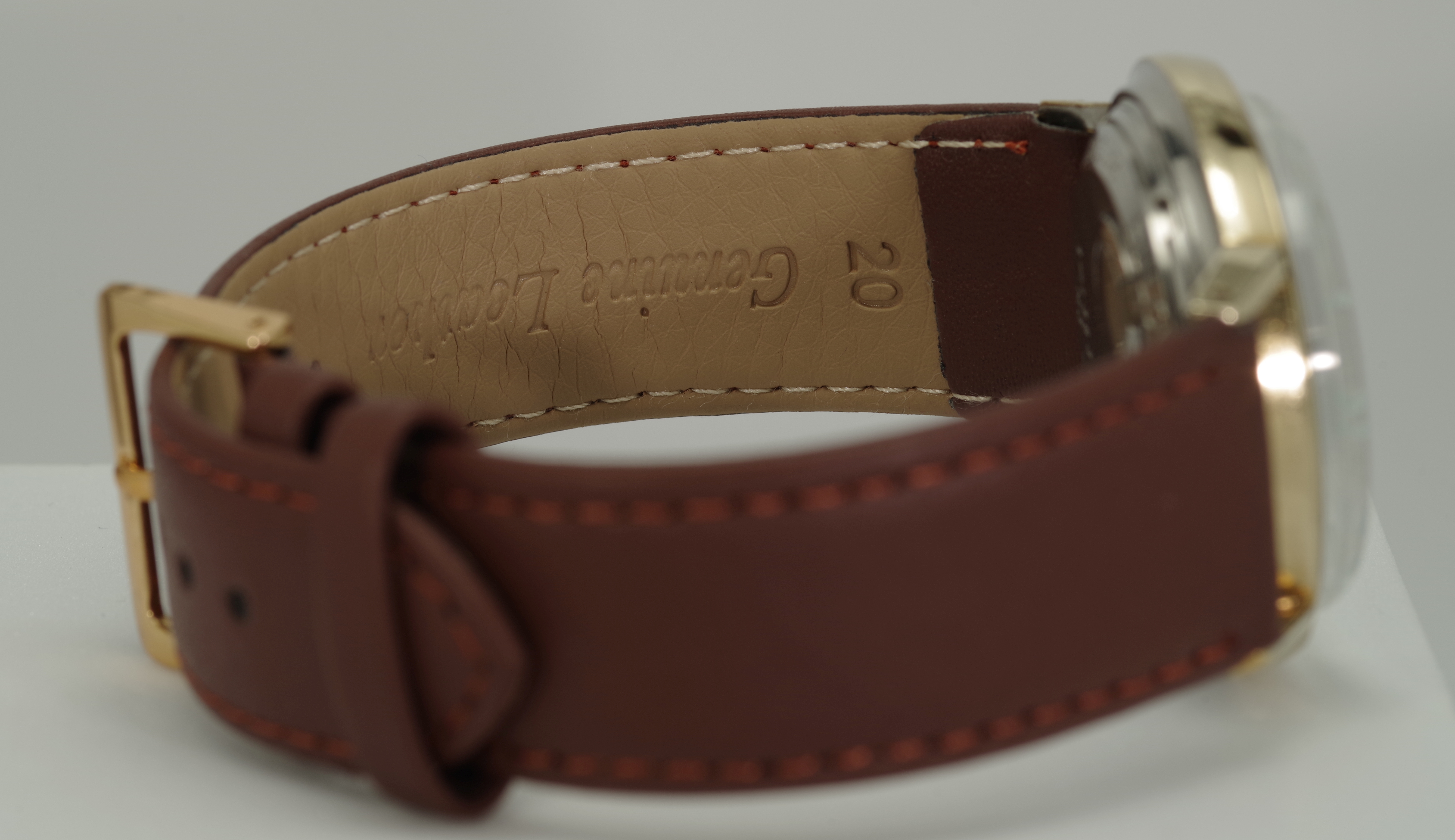 Die Uhr ist etwa 35 mm breit, 42 mm hoch, 12,5 mm dick. Der Abstand der Bandanstöße beträgt 18 mm. Montiert ist ein 20 mm Armband mit entsprechend ausgeschnittener Breite.