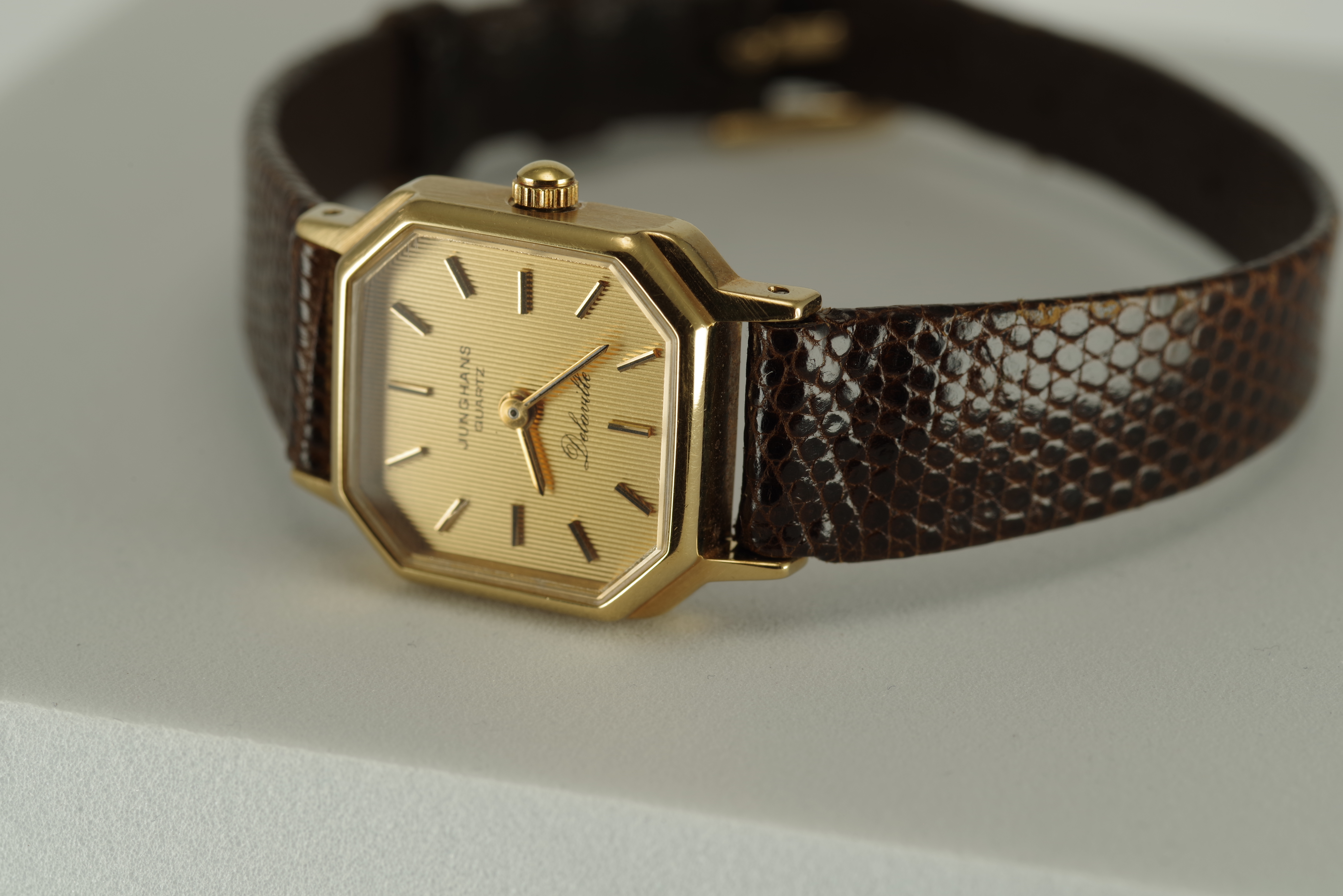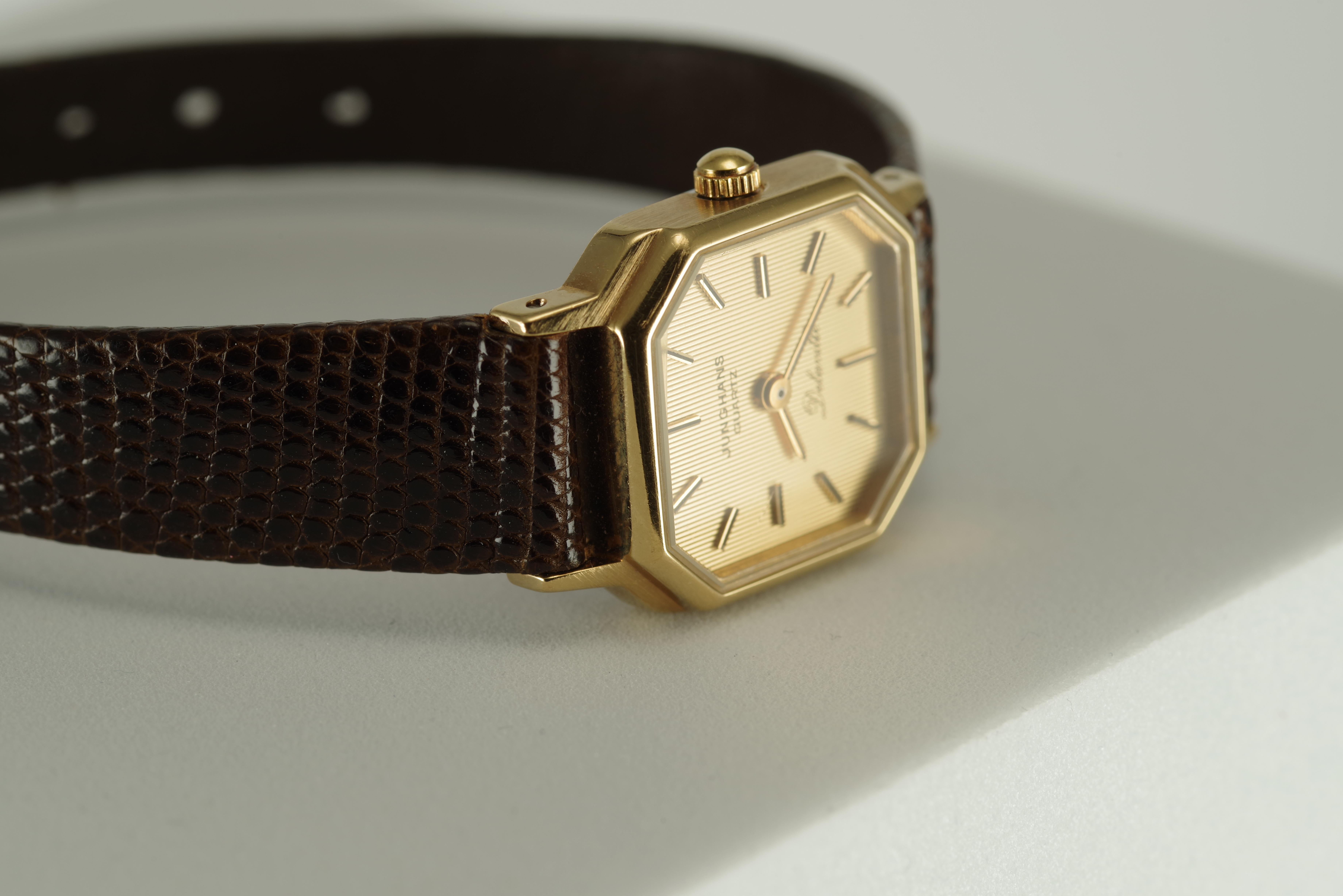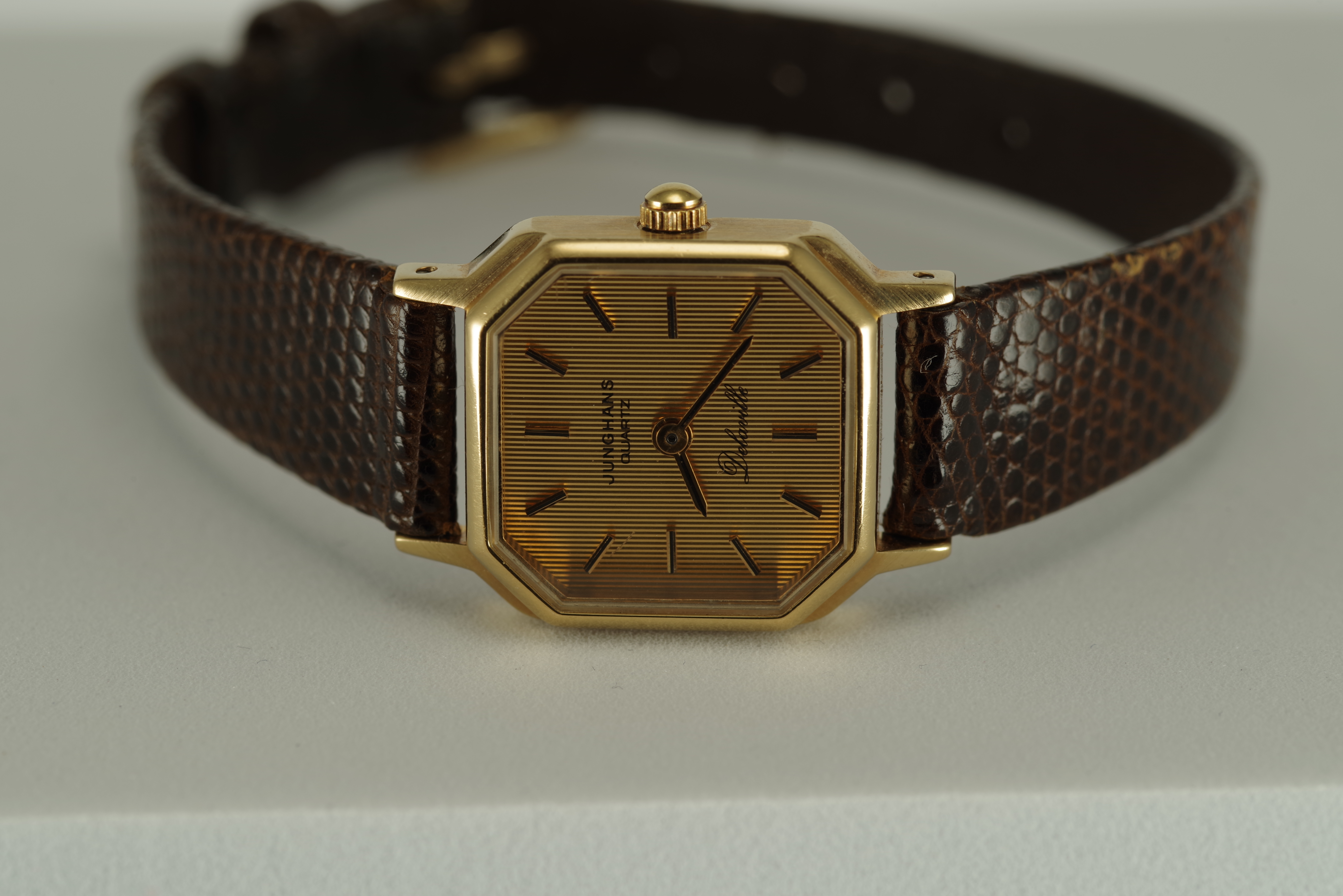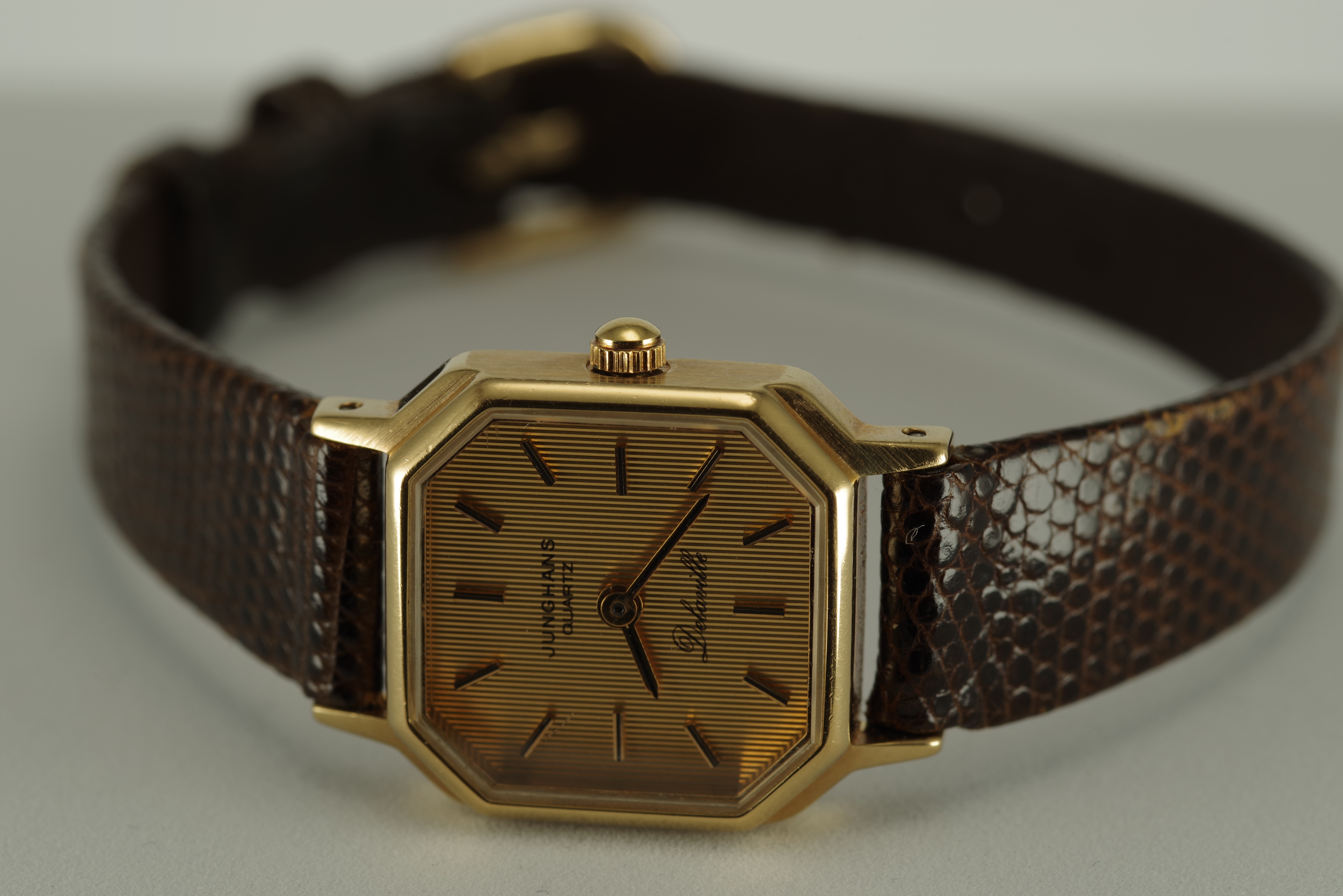 Damen Junghans Vintage Quarz Armbanduhr goldfarbenes Gehäuse braunes Armband