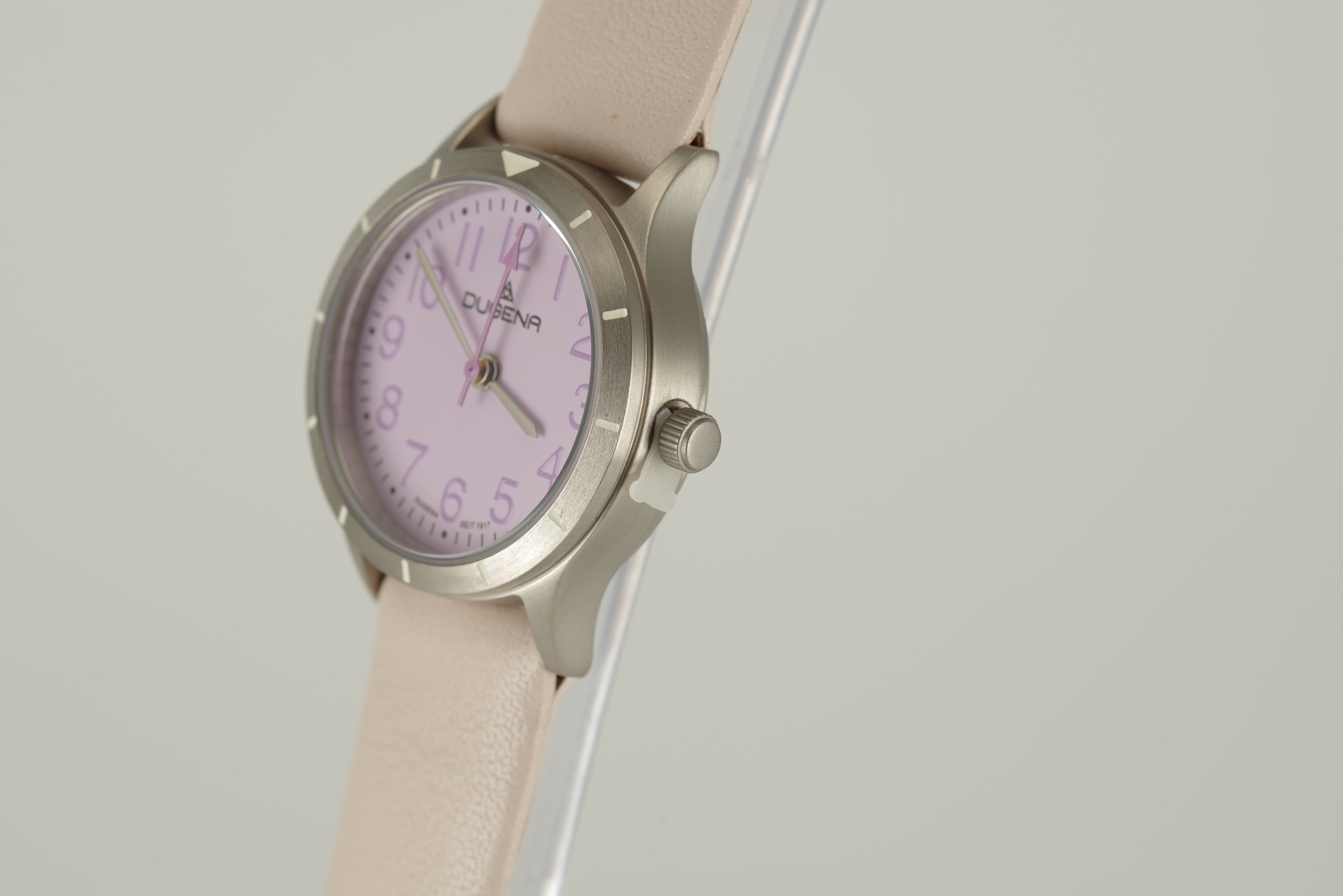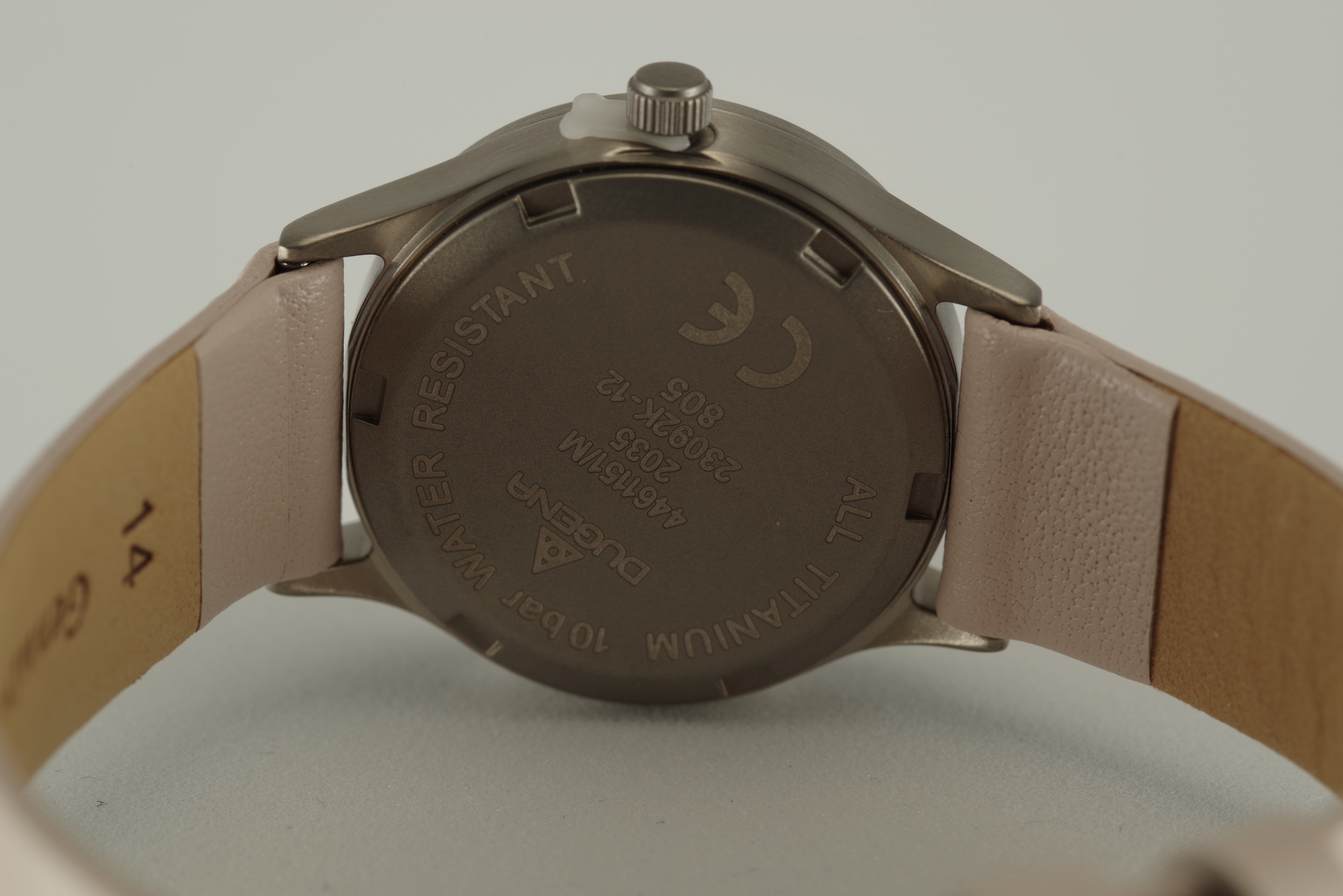 Produktinformationen "Feminine Dugena Armbanduhr Quartz Titan Mineralglas Kalbsleder Lila Beige"