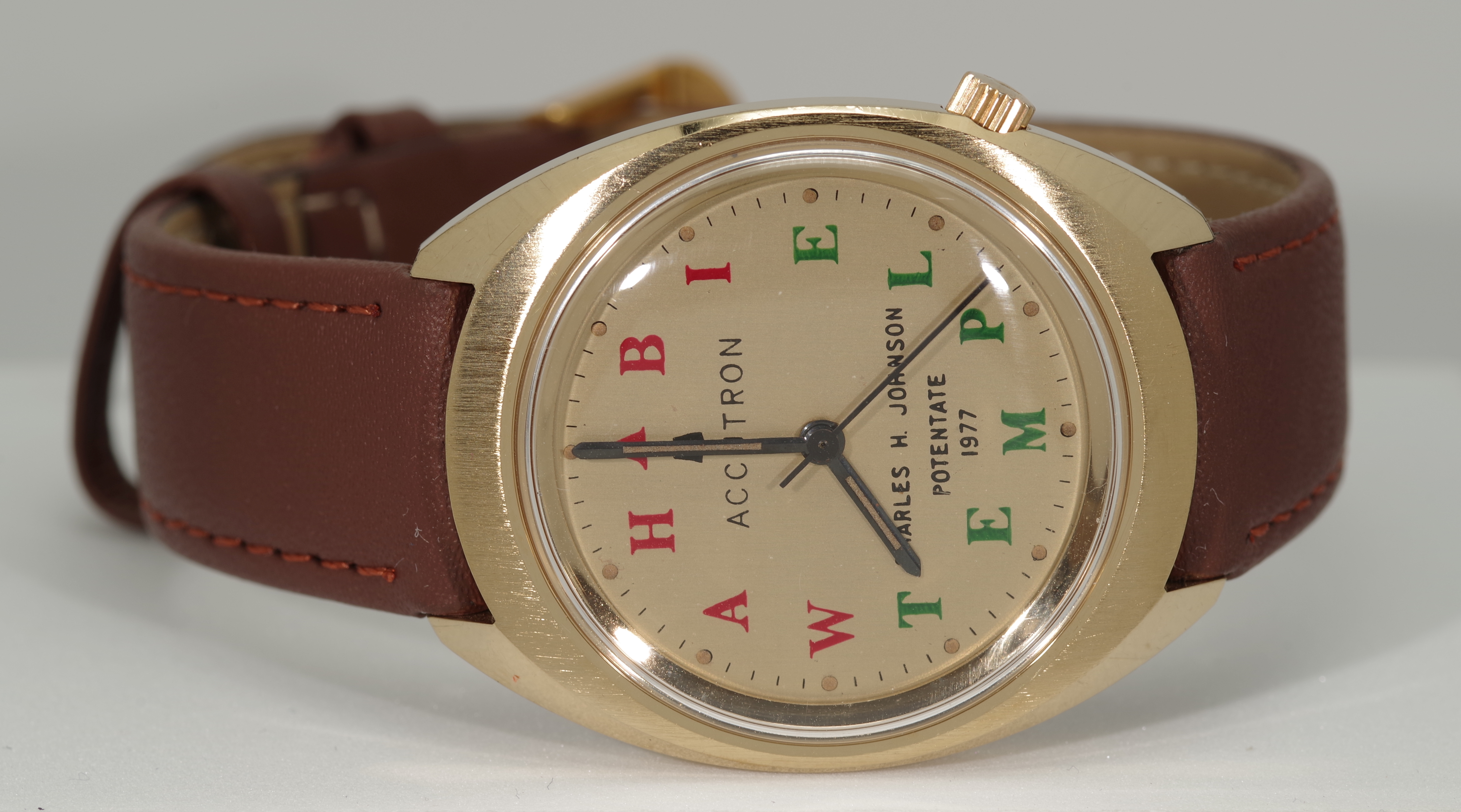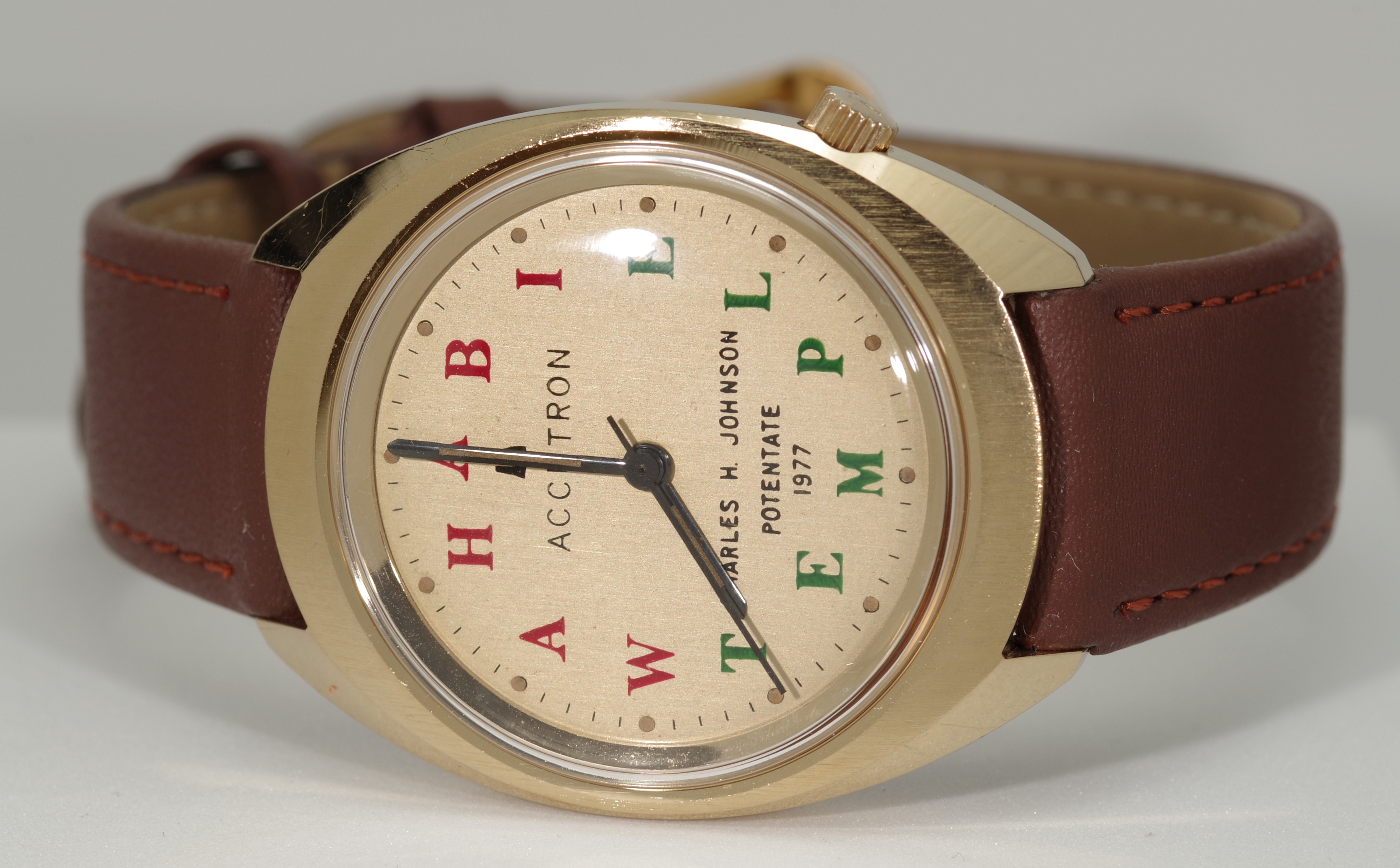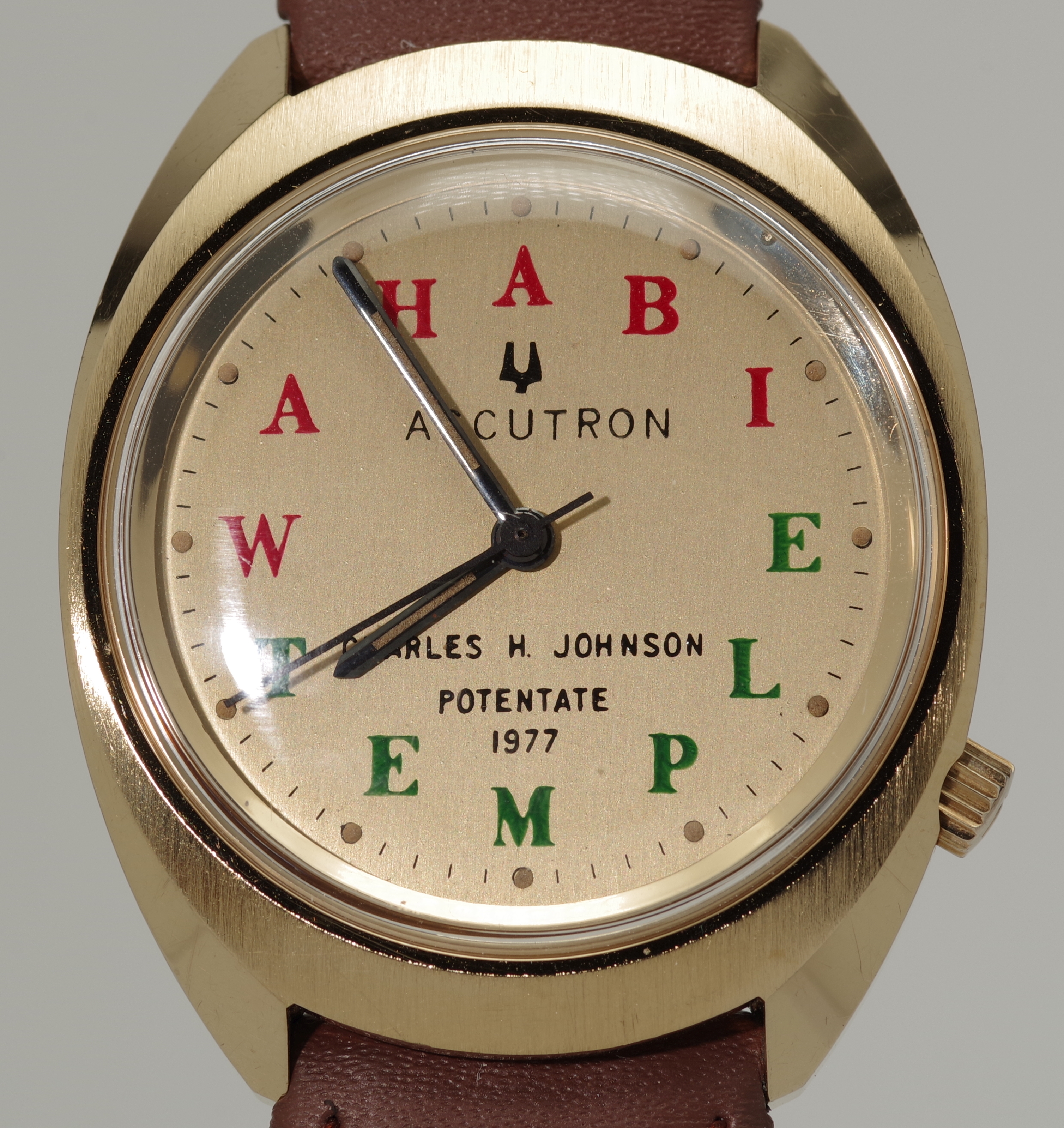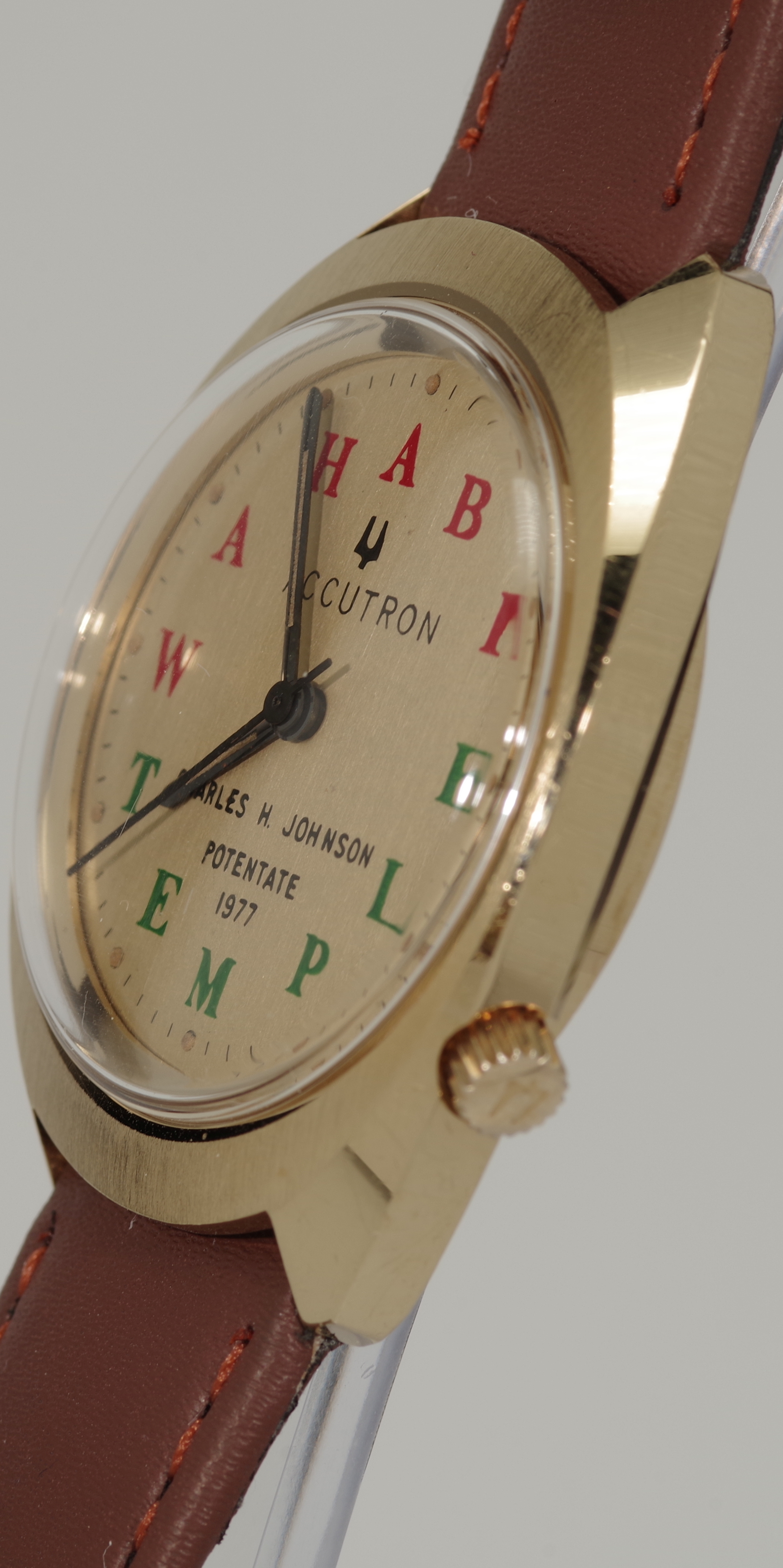 Zum Verkauf steht eine sehr gepflegte Vintage Bulova Accutron Herren Armbanduhr aus dem Jahr 1977 (N7) mit einem Stimmgabel Uhrwerk Bulova 2191.10. Die Inschrift auf dem Zifferblatt lautet: WAHABI TEMPLE / CHARLES H. JOHNSON / POTENTATE / 1977. Ob und welche geschichtliche Bedeutung die Inschrift hat ist hier unbekannt.