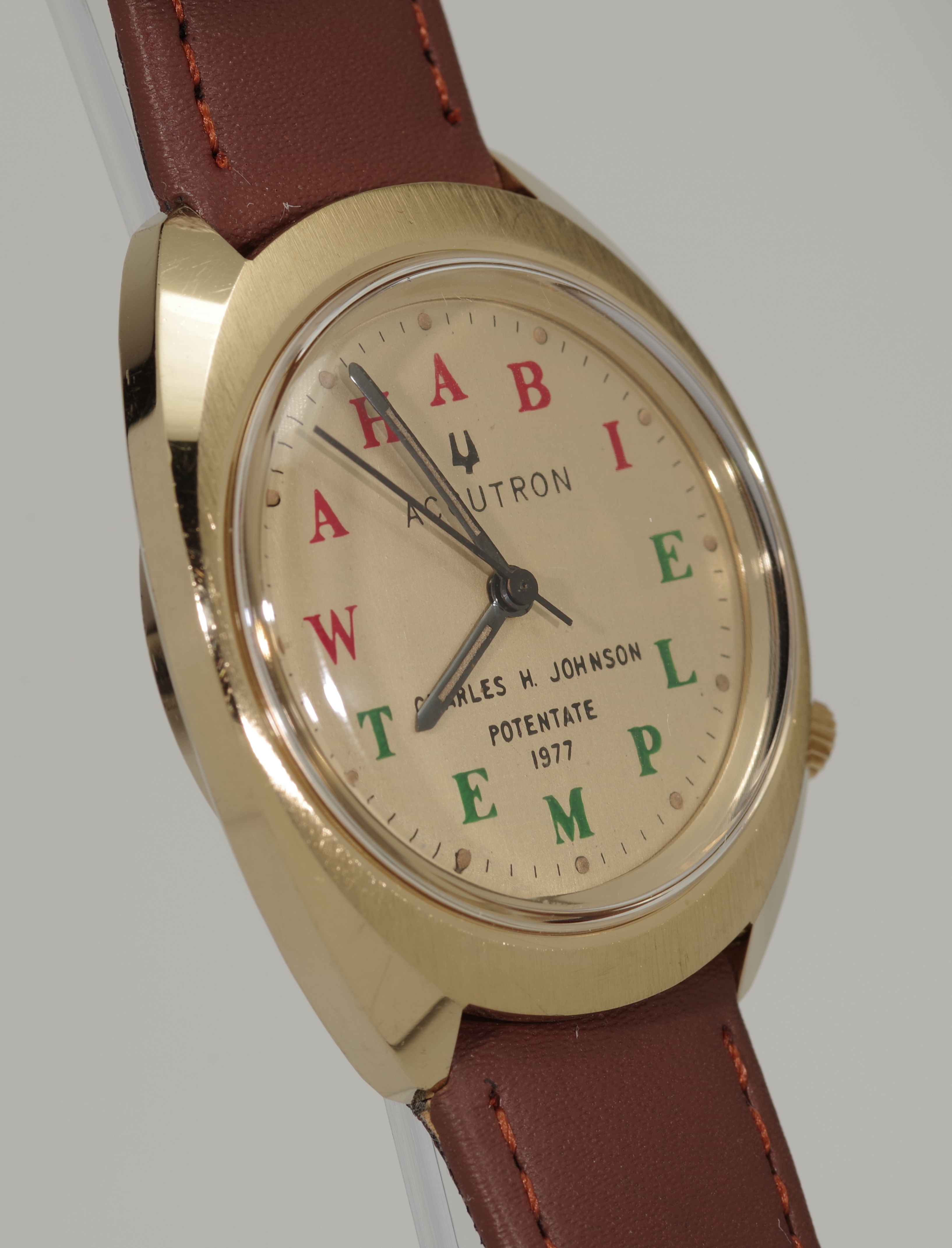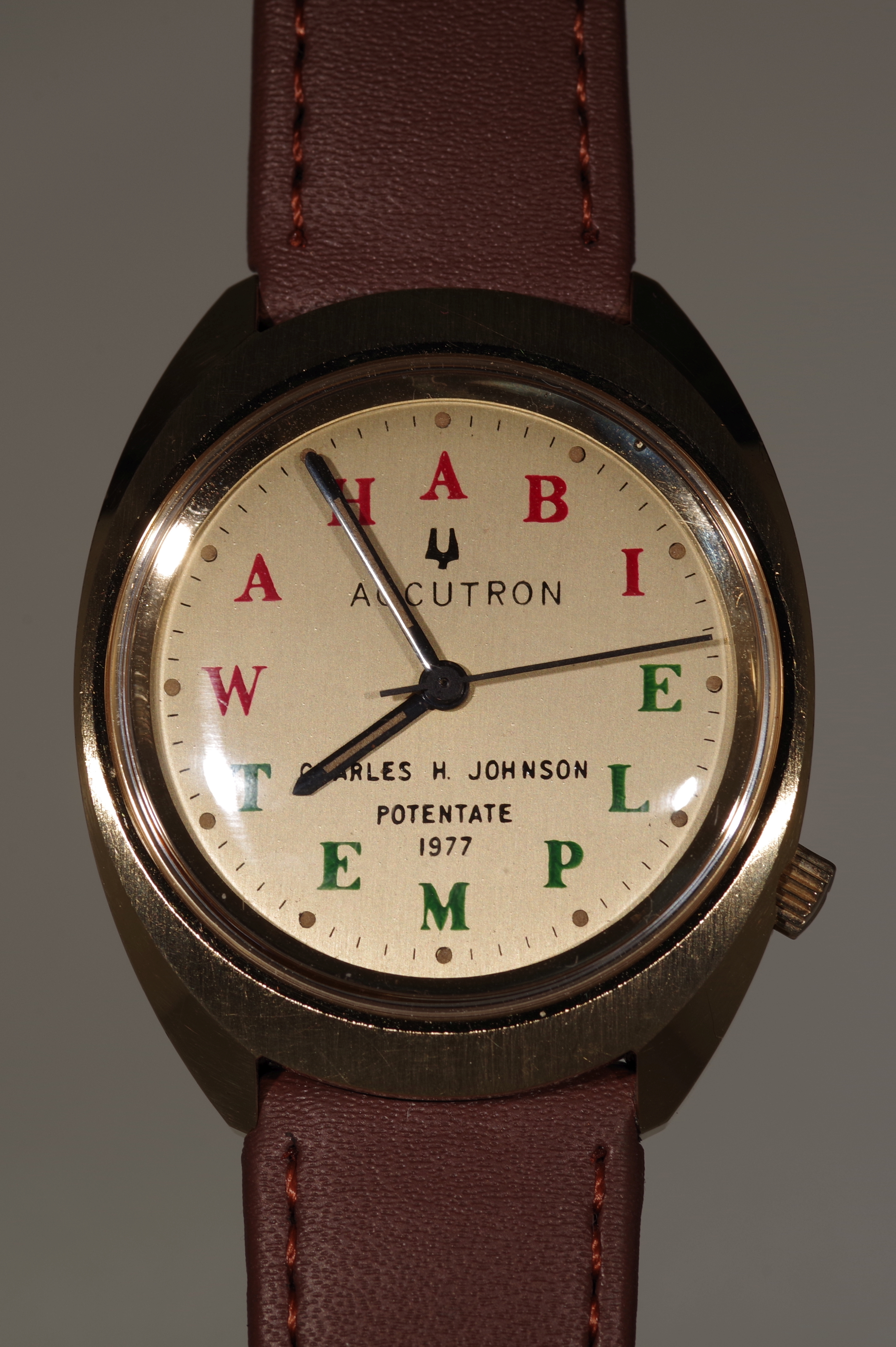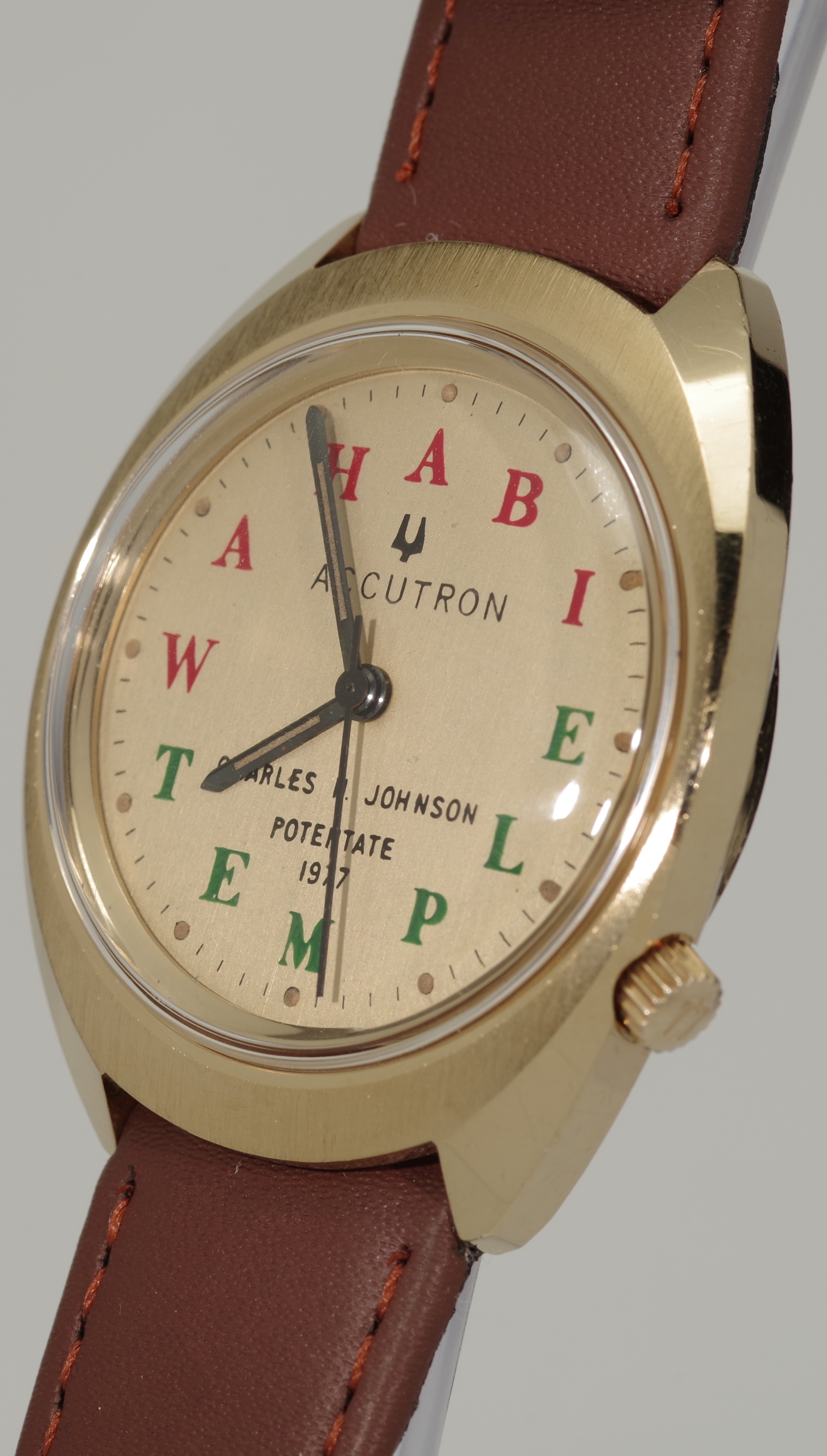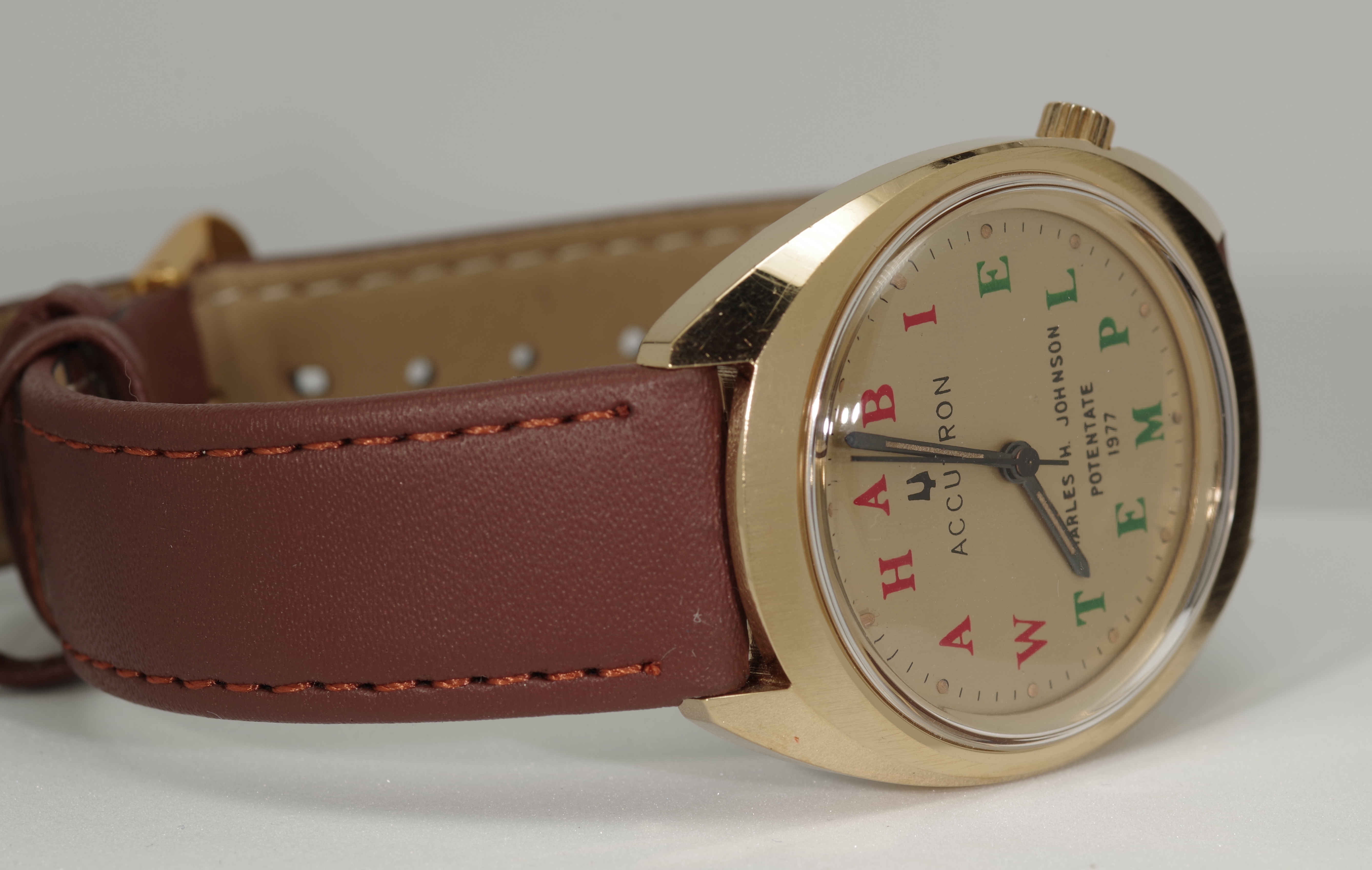 Zum Verkauf steht eine sehr gepflegte Vintage Bulova Accutron Herren Armbanduhr aus dem Jahr 1977 (N7) mit einem Stimmgabel Uhrwerk Bulova 2191.10. Die Inschrift auf dem Zifferblatt lautet: WAHABI TEMPLE / CHARLES H. JOHNSON / POTENTATE / 1977. Ob und welche geschichtliche Bedeutung die Inschrift hat ist hier unbekannt.