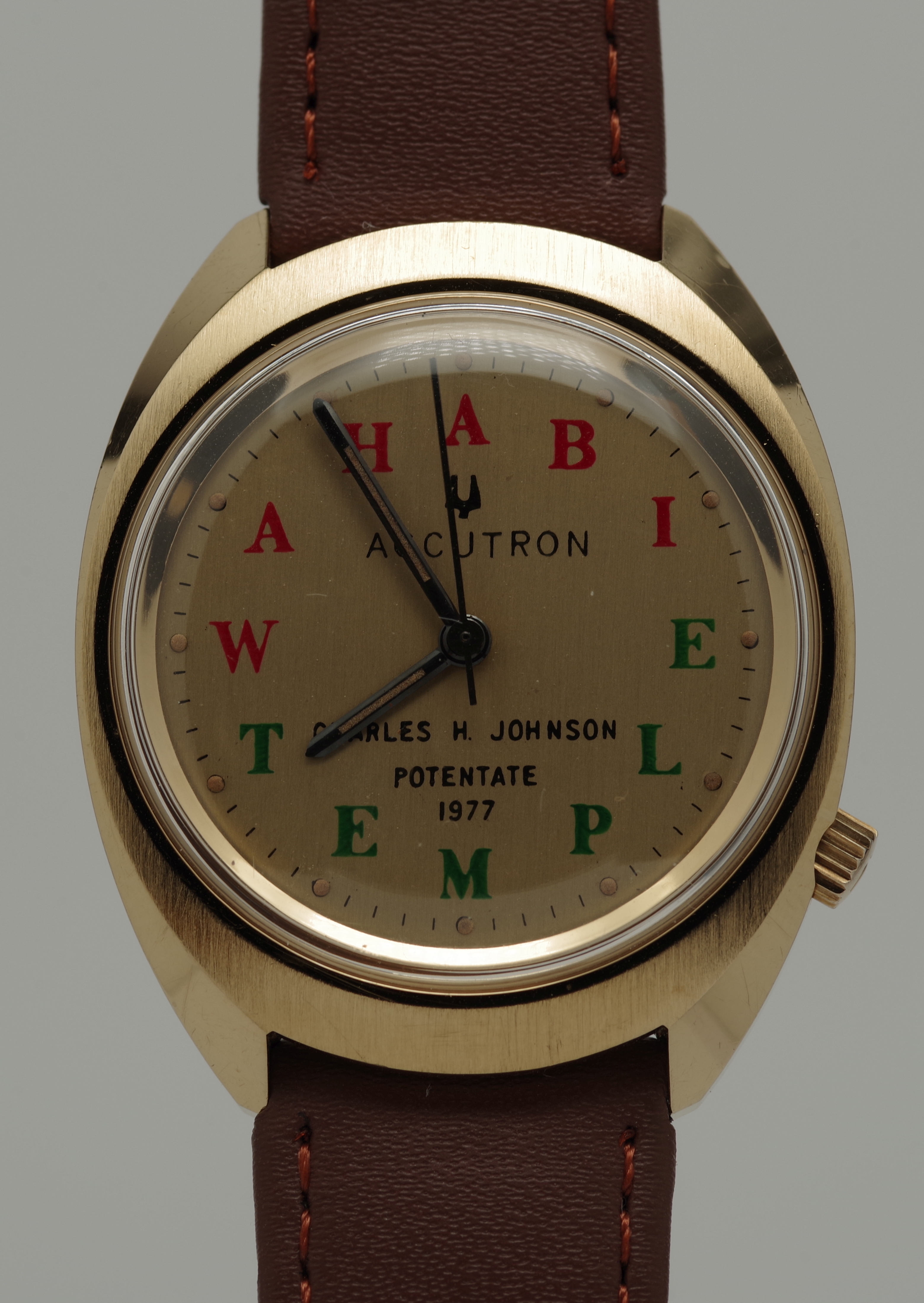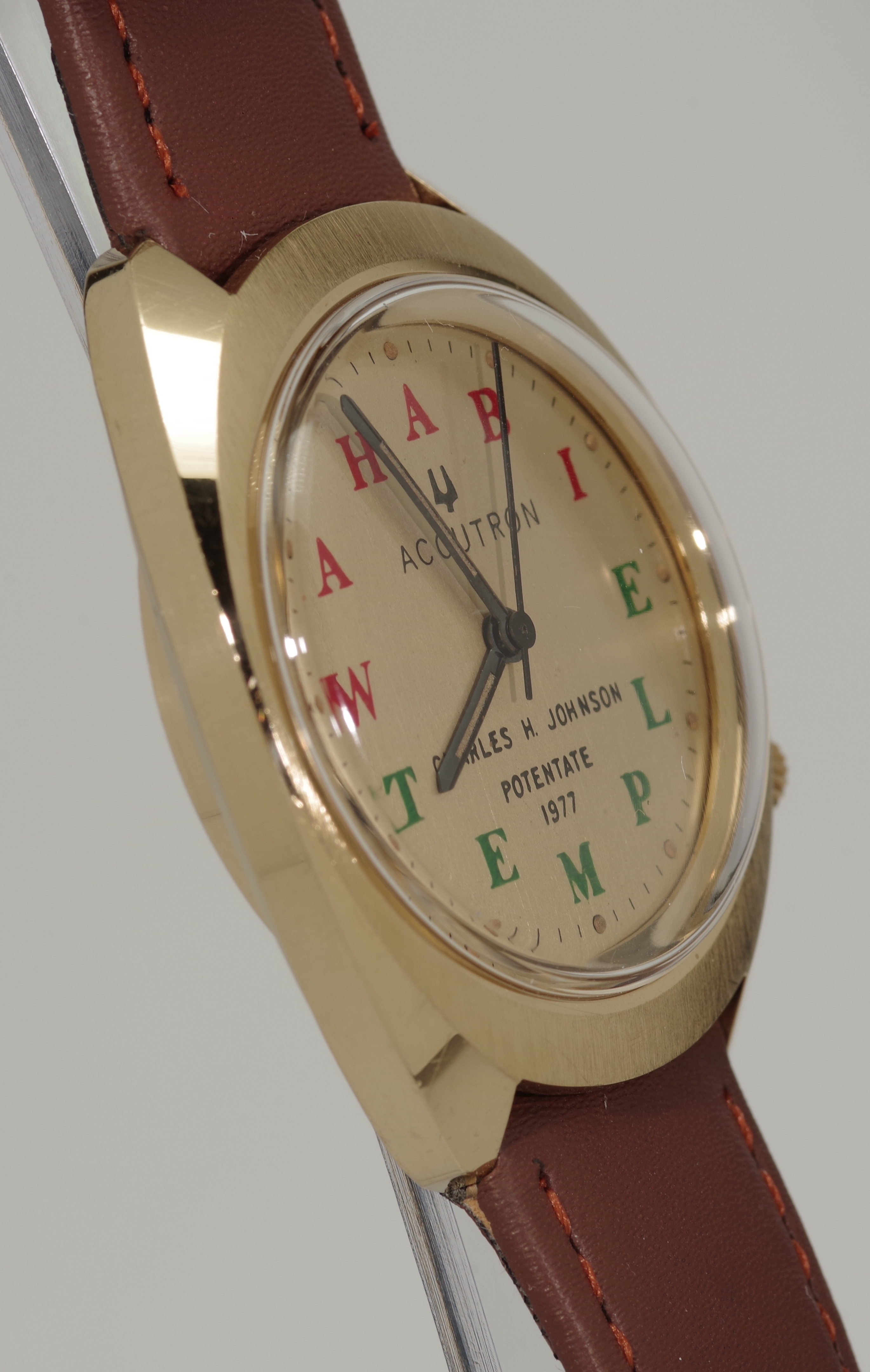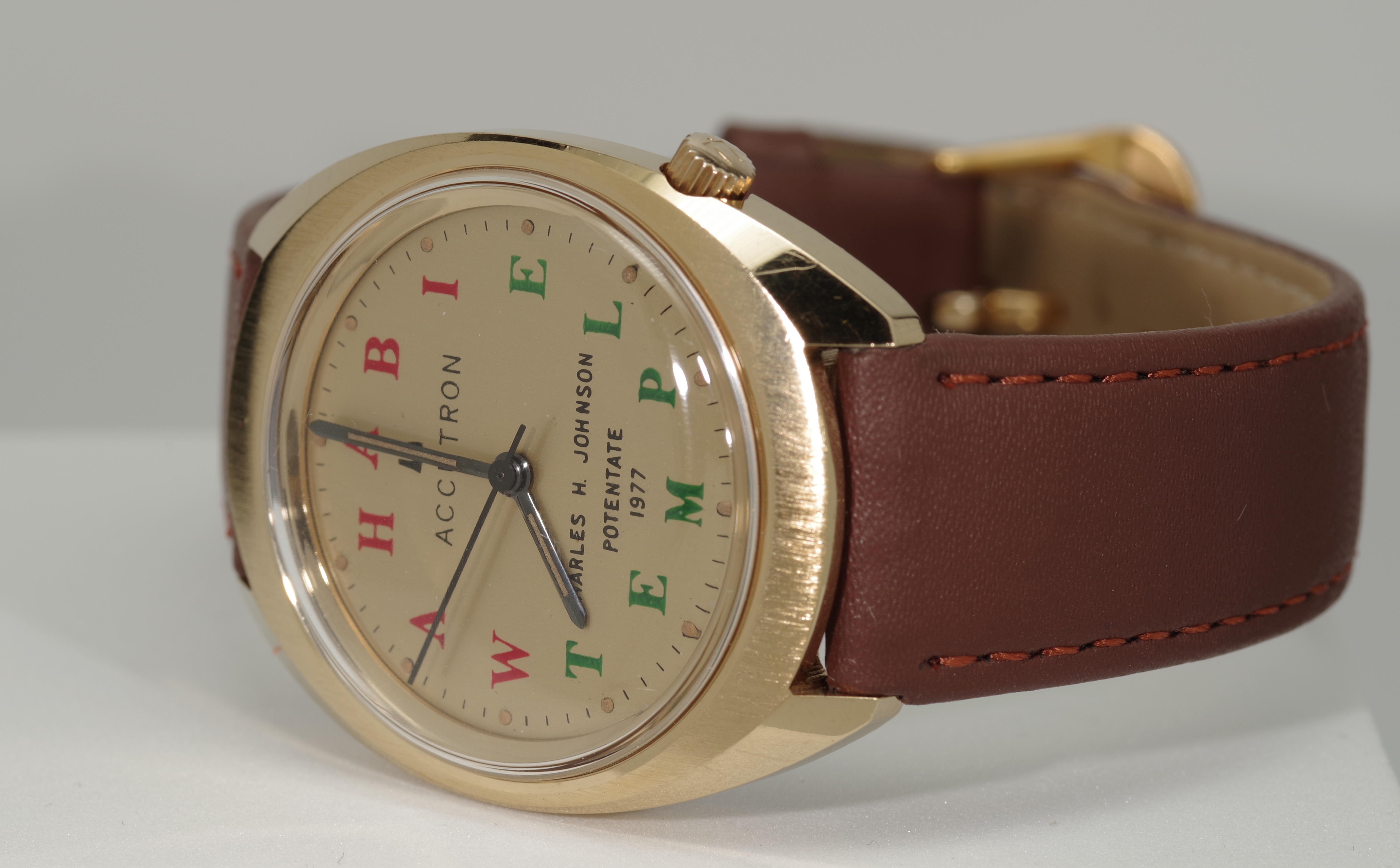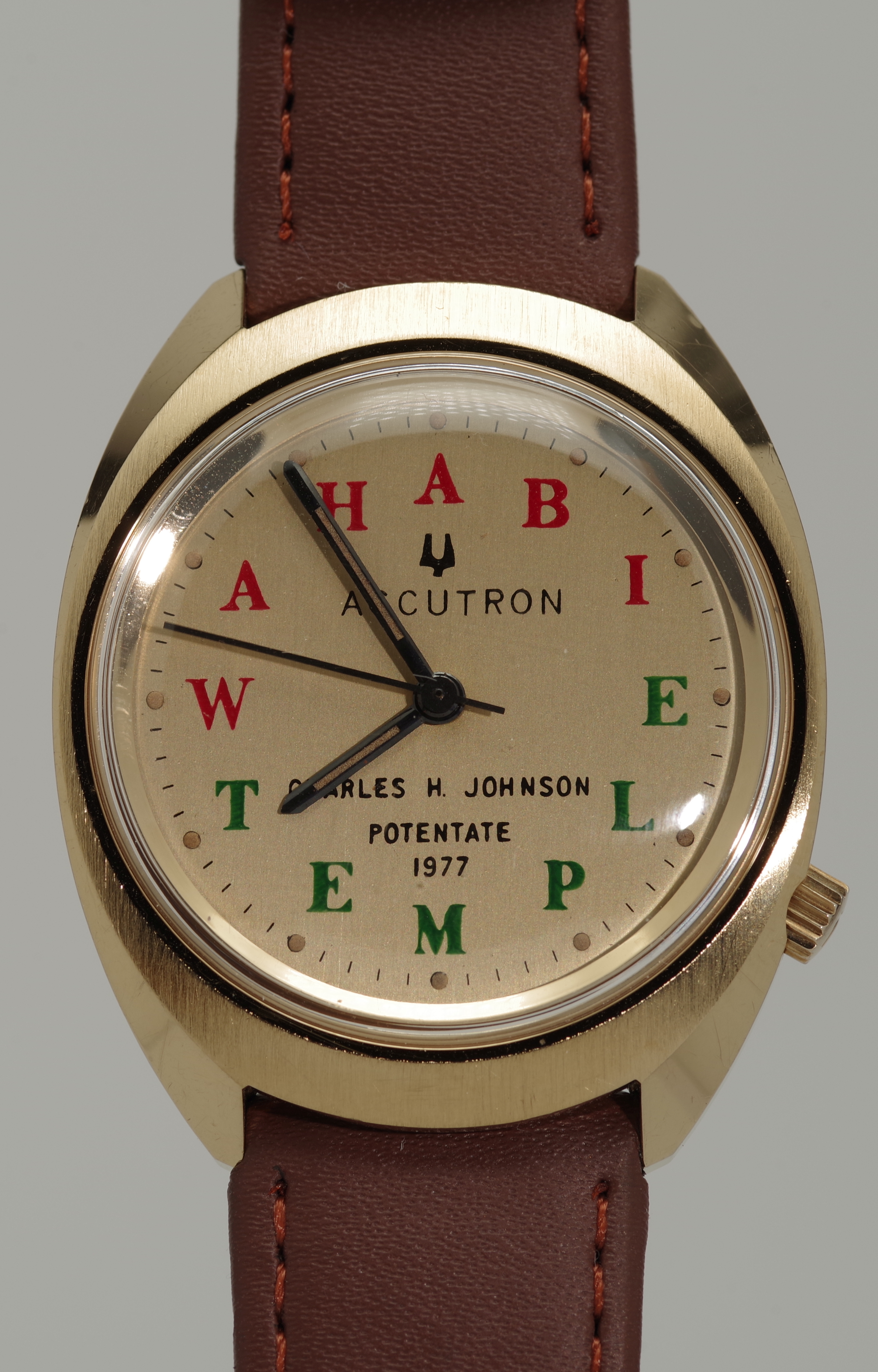 Zum Verkauf steht eine sehr gepflegte Vintage Bulova Accutron Herren Armbanduhr aus dem Jahr 1977 (N7) mit einem Stimmgabel Uhrwerk Bulova 2191.10. Die Inschrift auf dem Zifferblatt lautet: WAHABI TEMPLE / CHARLES H. JOHNSON / POTENTATE / 1977. Ob und welche geschichtliche Bedeutung die Inschrift hat ist hier unbekannt.