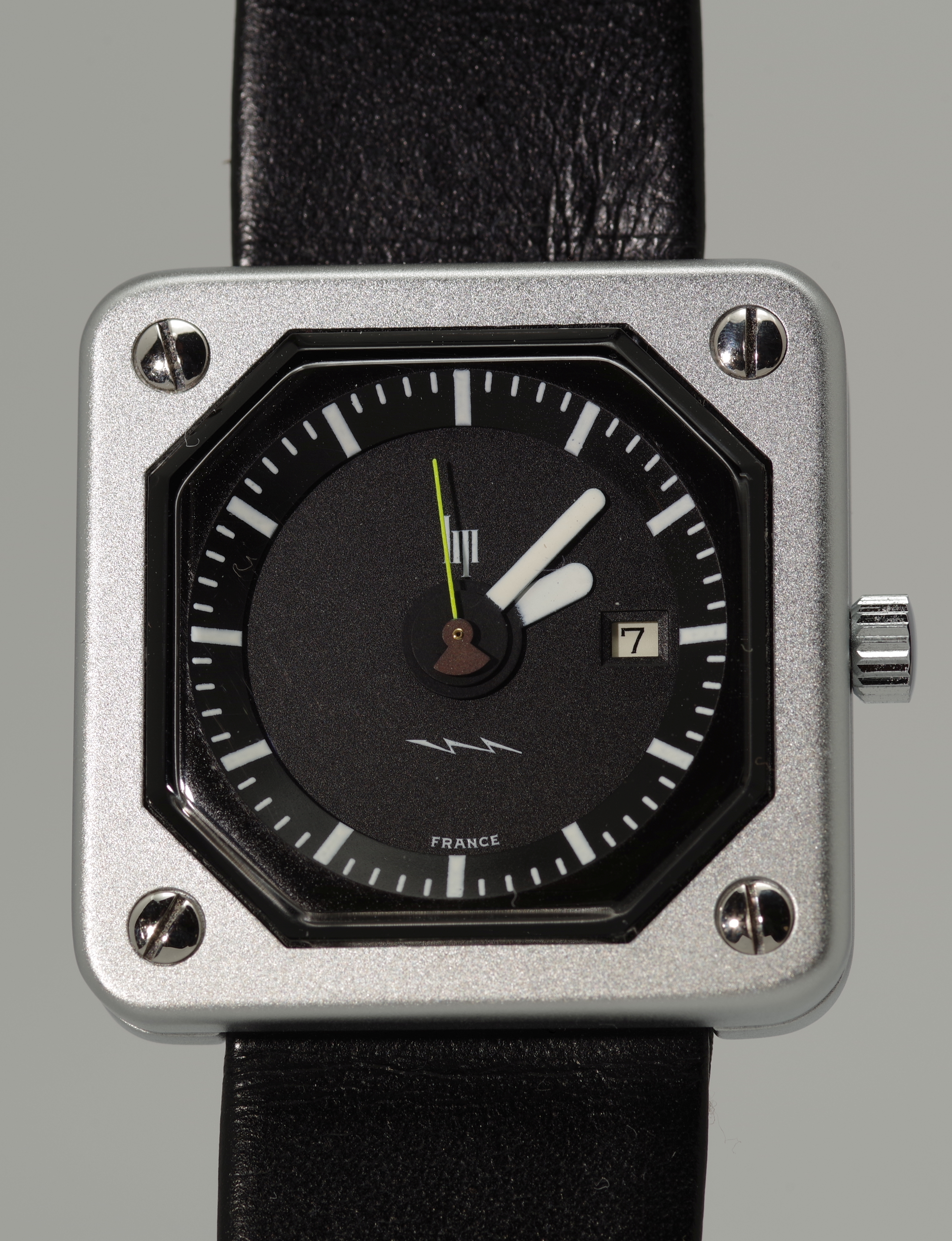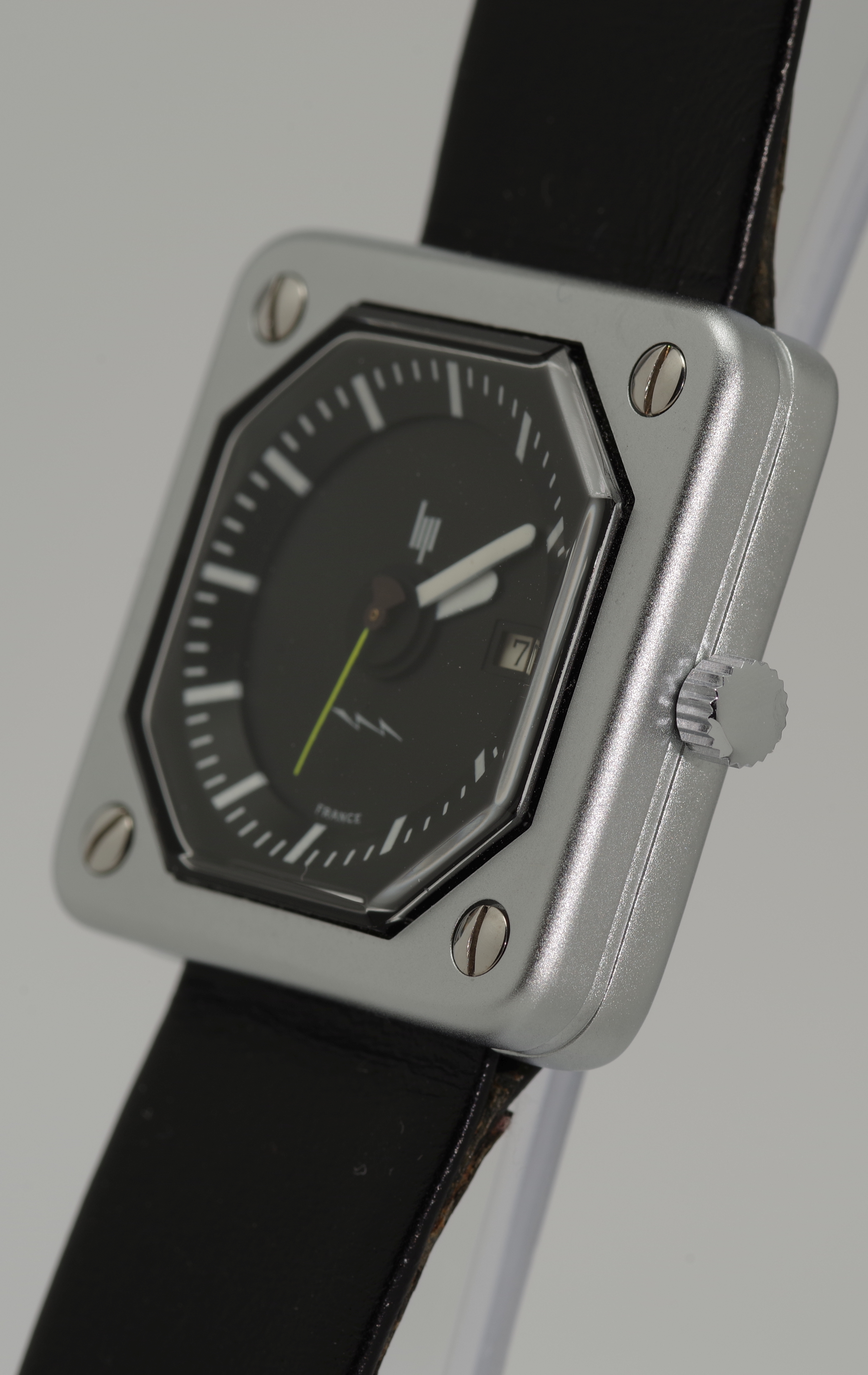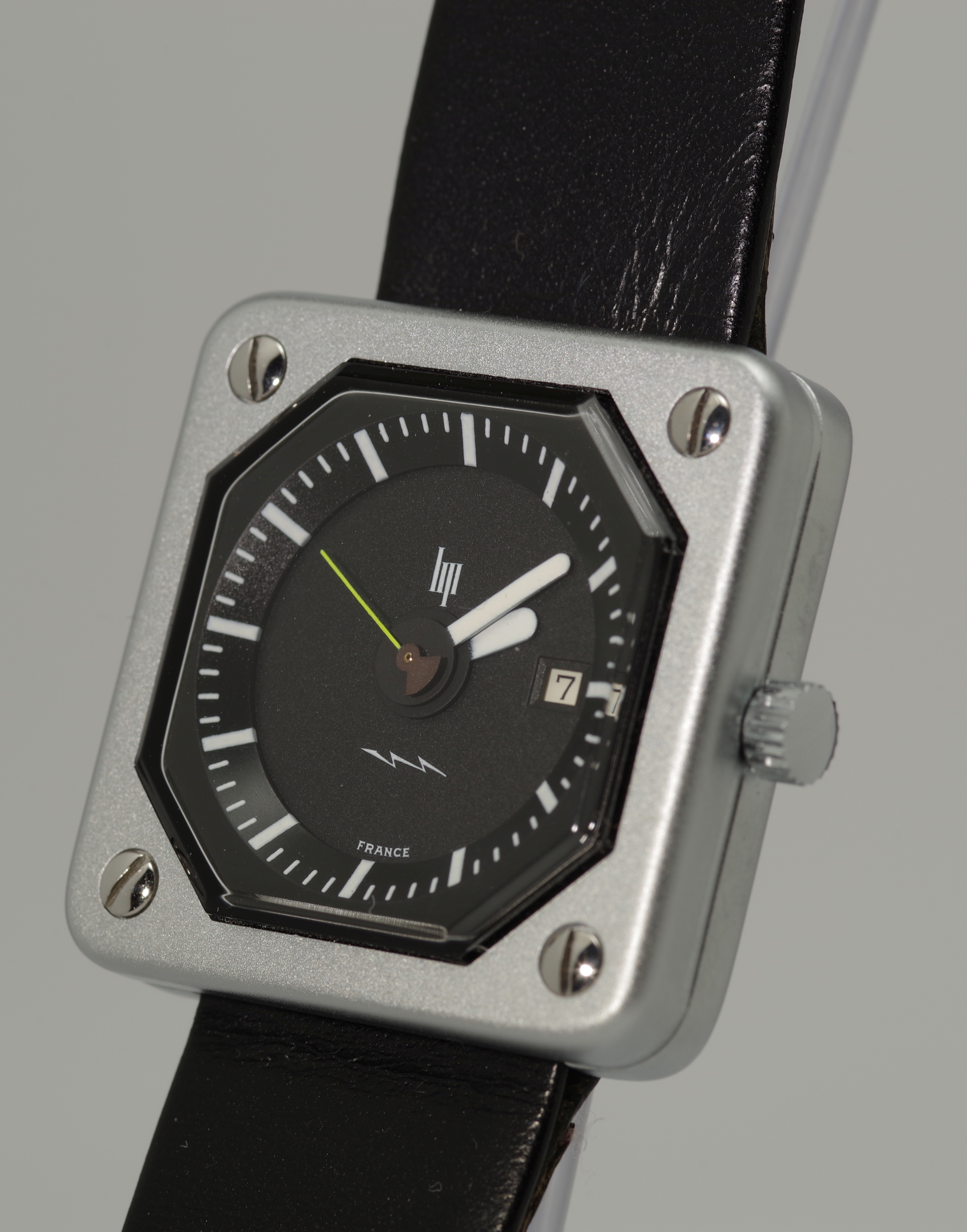 Im Verkauf befindet sich als Rarität diese Herren-Armbanduhr des französischen Uhrenherstellers LIP aus den 1975-er Jahren in vorzüglicher Luxus-Erhaltung und in absolut sammelwürdigem Zustand. Diese einzigartige Modellreihe wurde vom Schweizer Designer Rudi Meyer entworfen und liefert die finale, raffinierte Version dessen, was eine schöne Formuhr für einen Industriegrafikdesigner bedeutet.