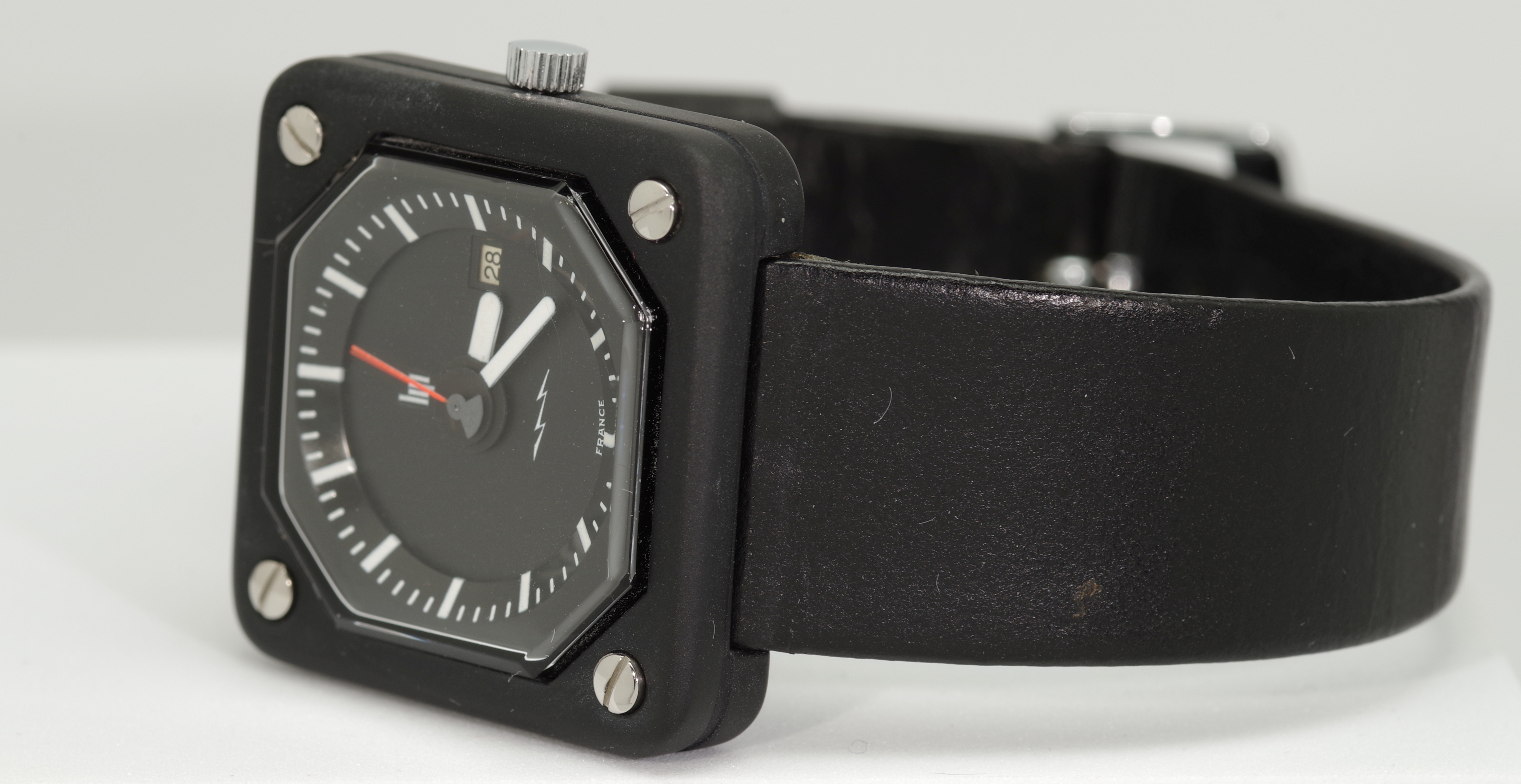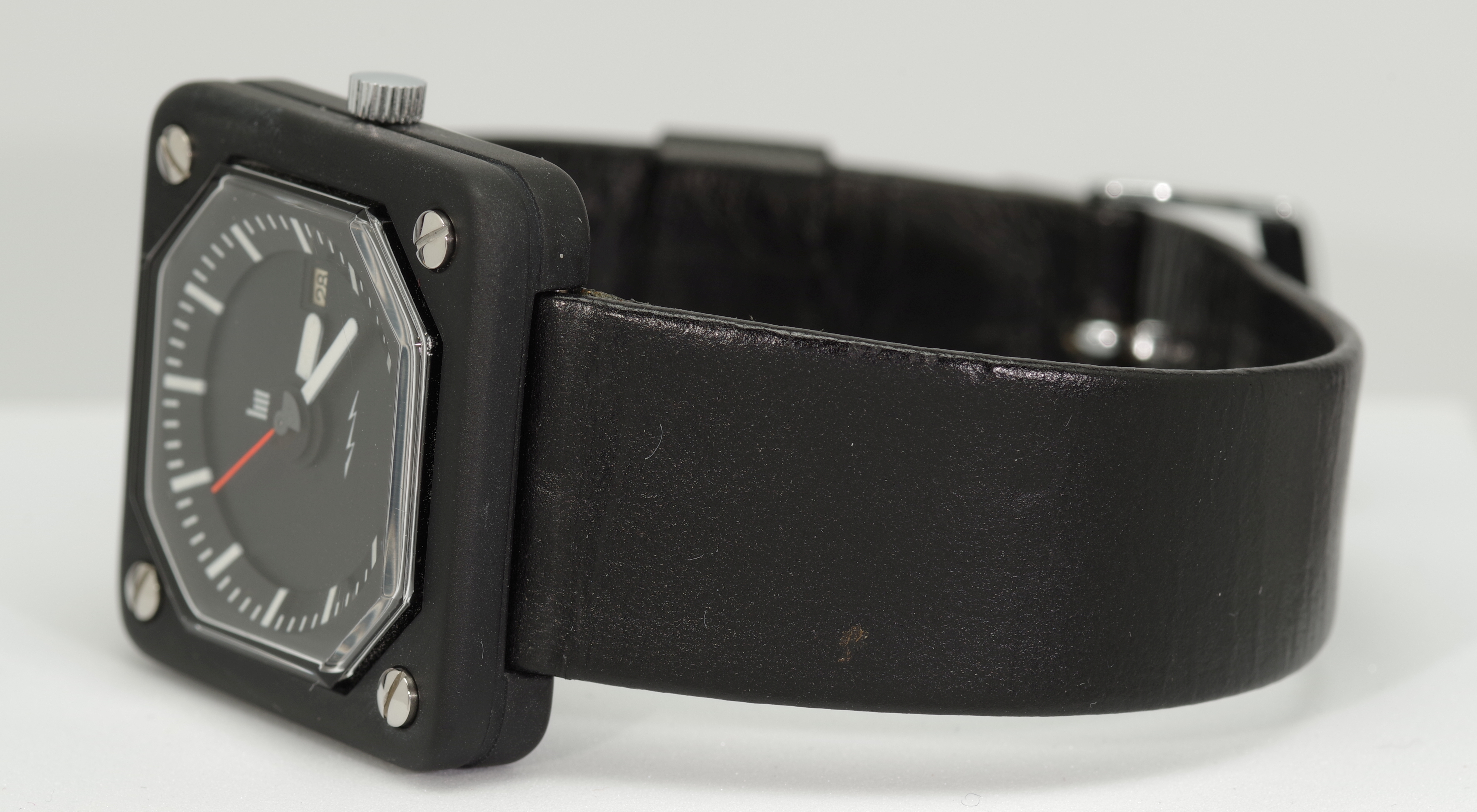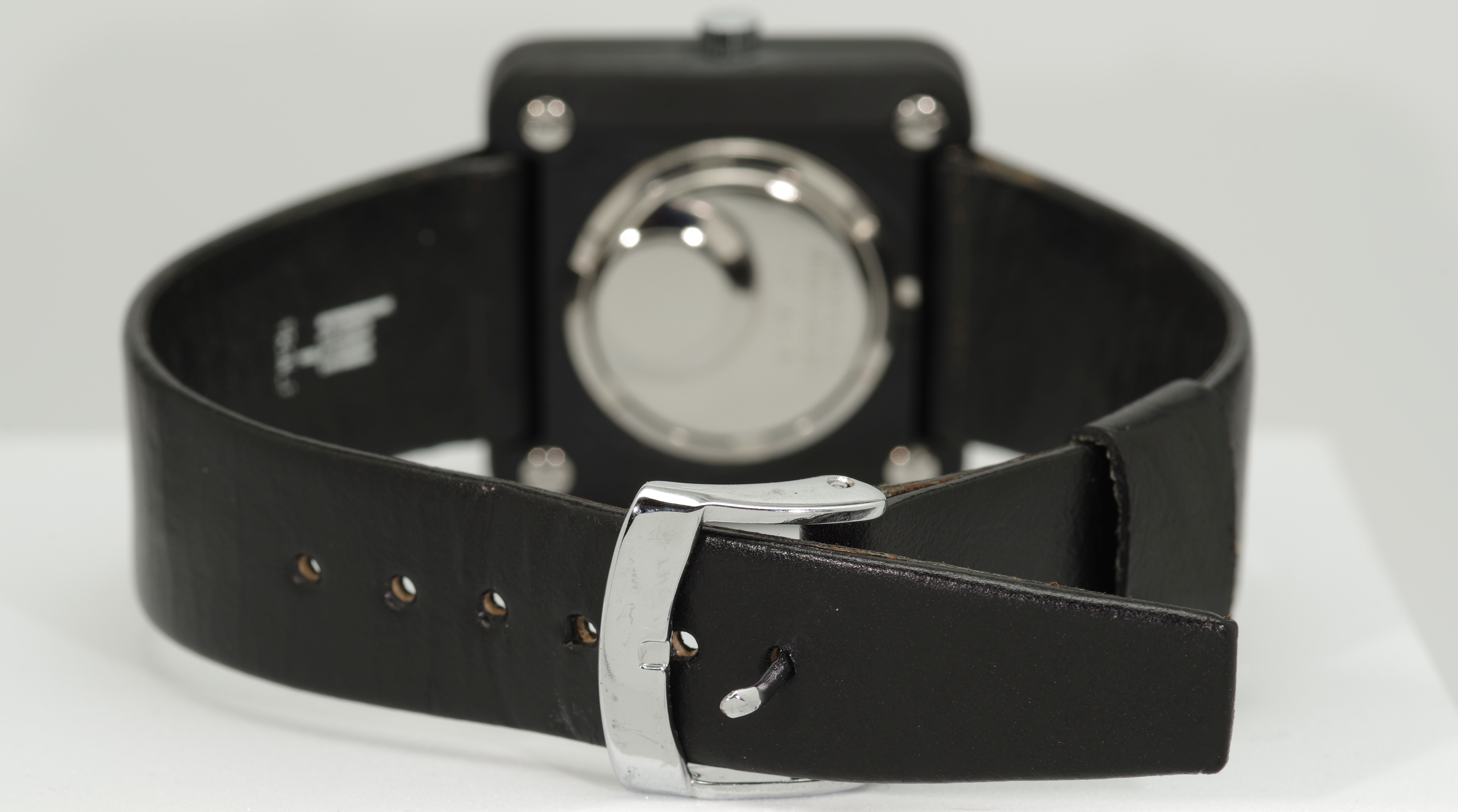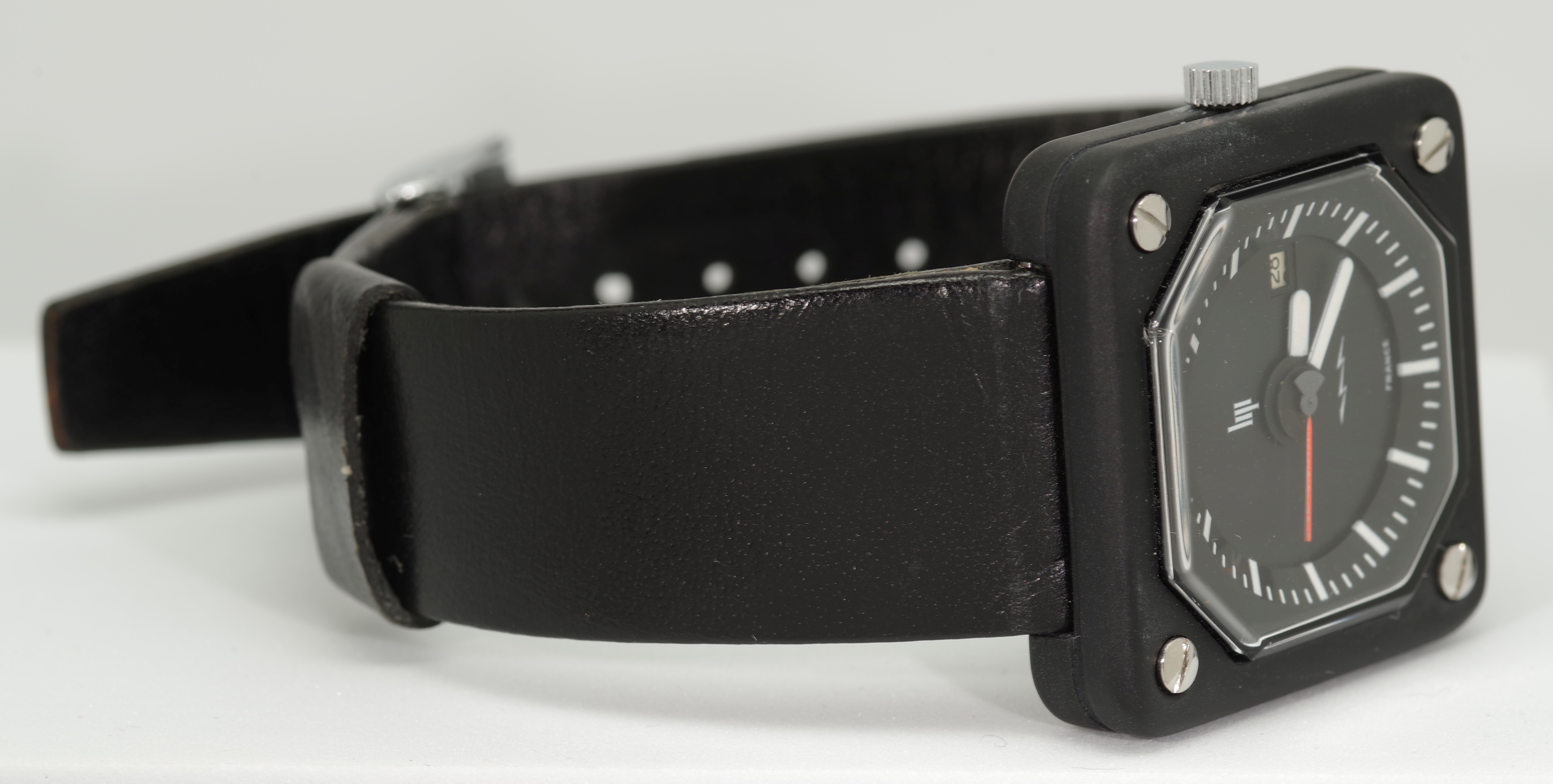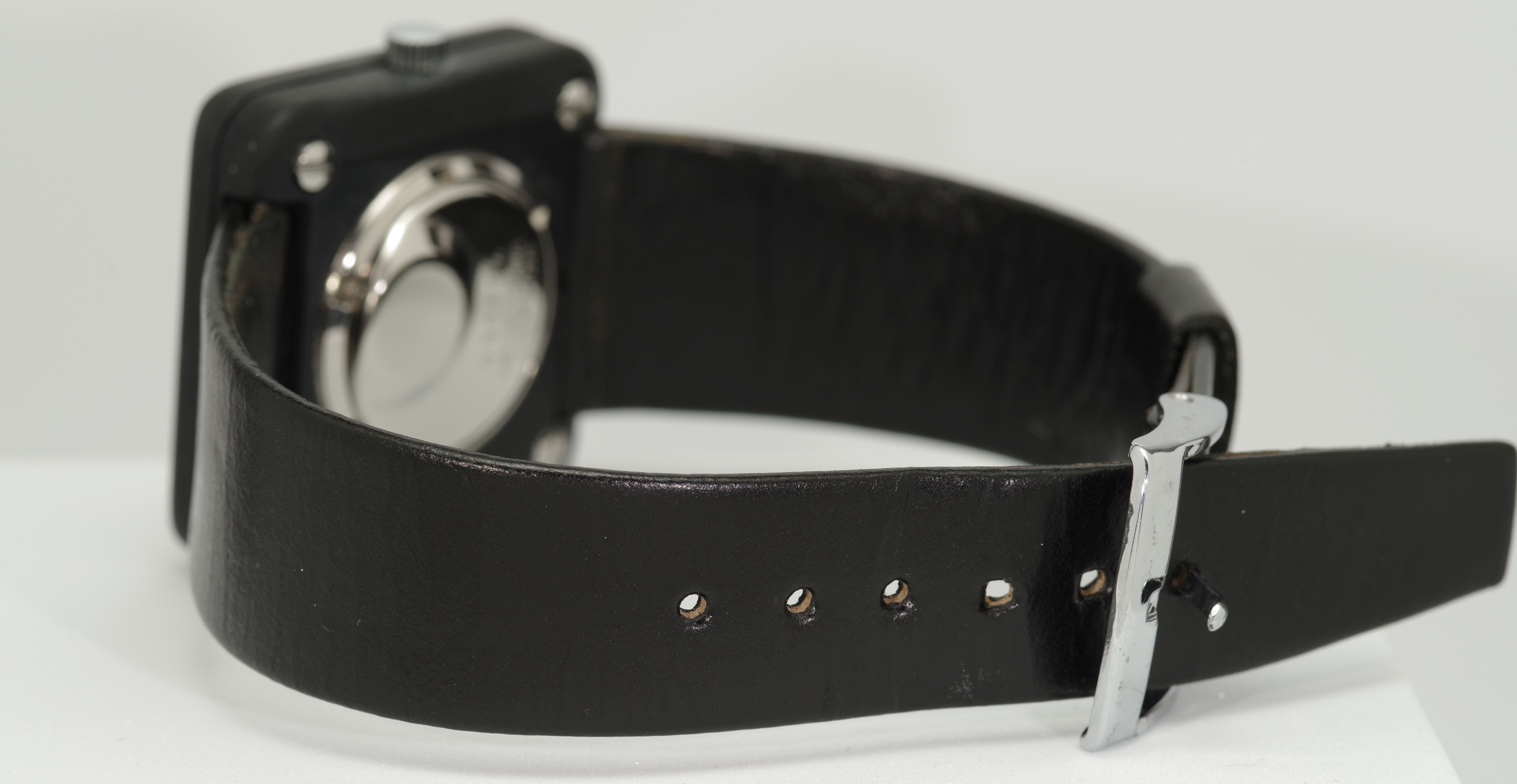 Insgesamt besteht diese Reihe aus vier Modellen. Dieses Modell mit der Referenz-Nummer 43841 ist die Variante mit weißen Strich-Indexes auf schwarzem Zifferblatt und schwarzem Gehäuse.