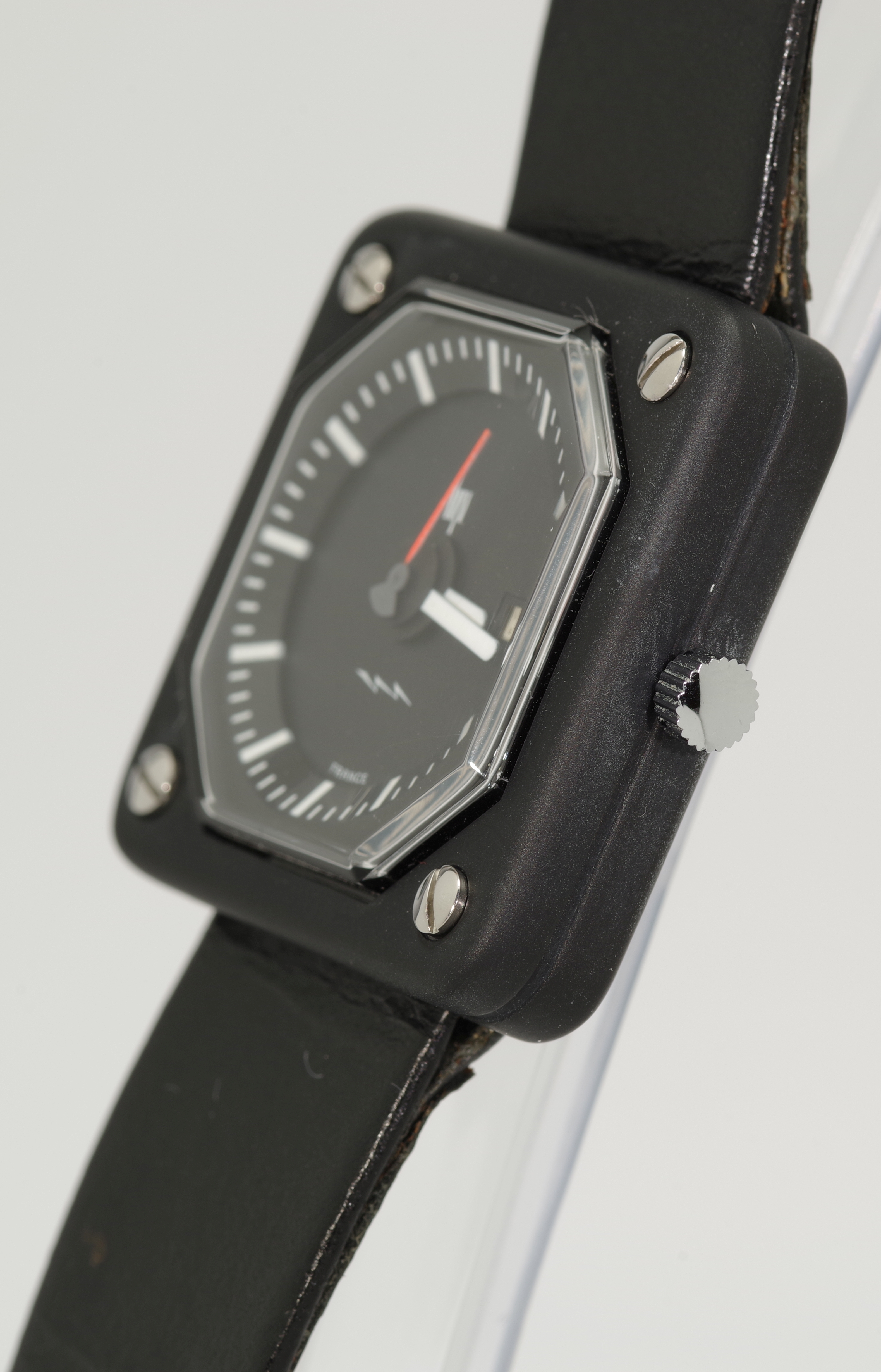 Im Verkauf befindet sich als Rarität diese Herren-Armbanduhr des französischen Uhrenherstellers LIP aus den 1975-er Jahren in vorzüglicher Luxus-Erhaltung und in absolut sammelwürdigem Zustand. Diese einzigartige Modellreihe wurde vom Schweizer Designer Rudi Meyer entworfen und liefert die finale, raffinierte Version dessen, was eine schöne Formuhr für einen Industriegrafikdesigner bedeutet.