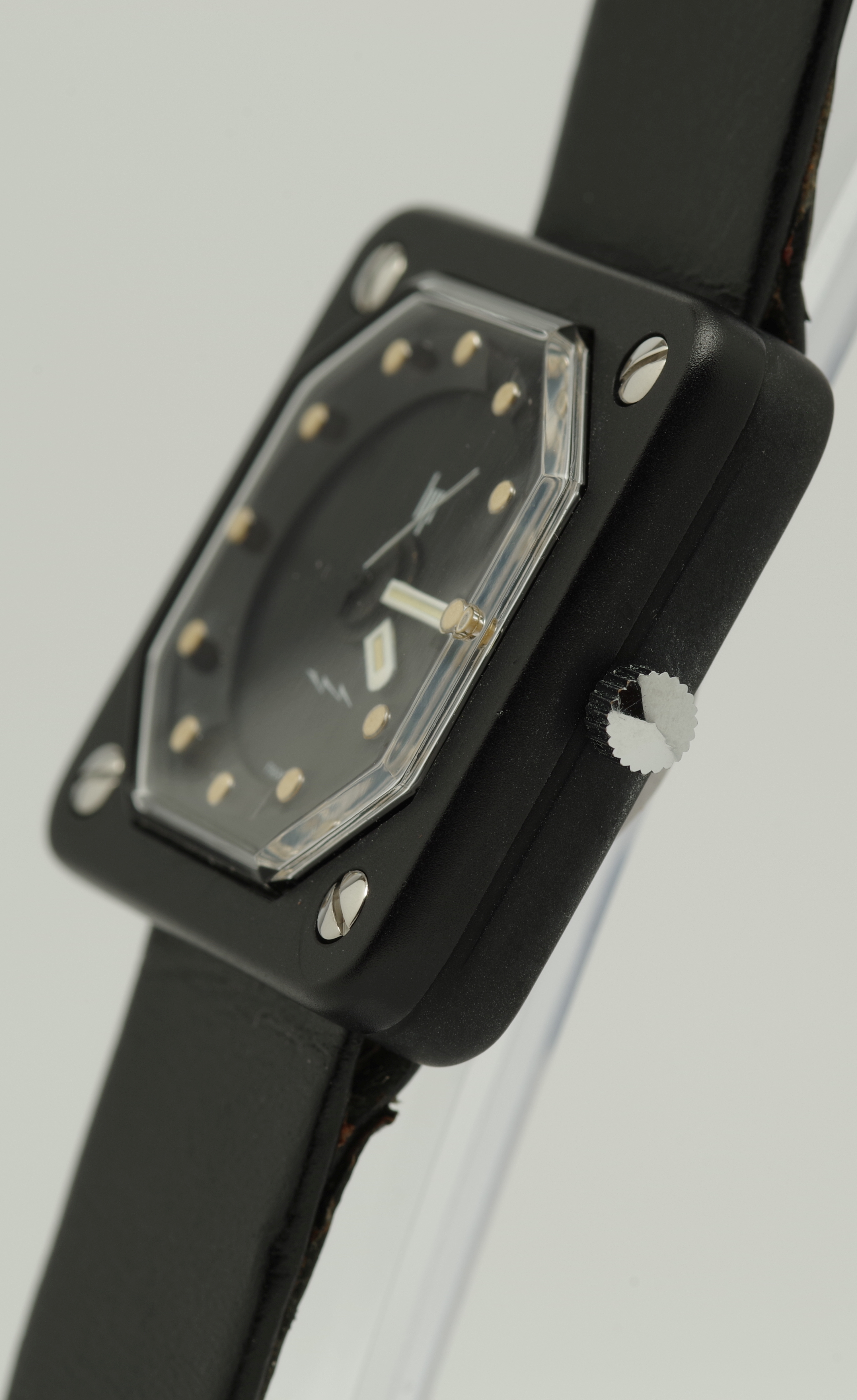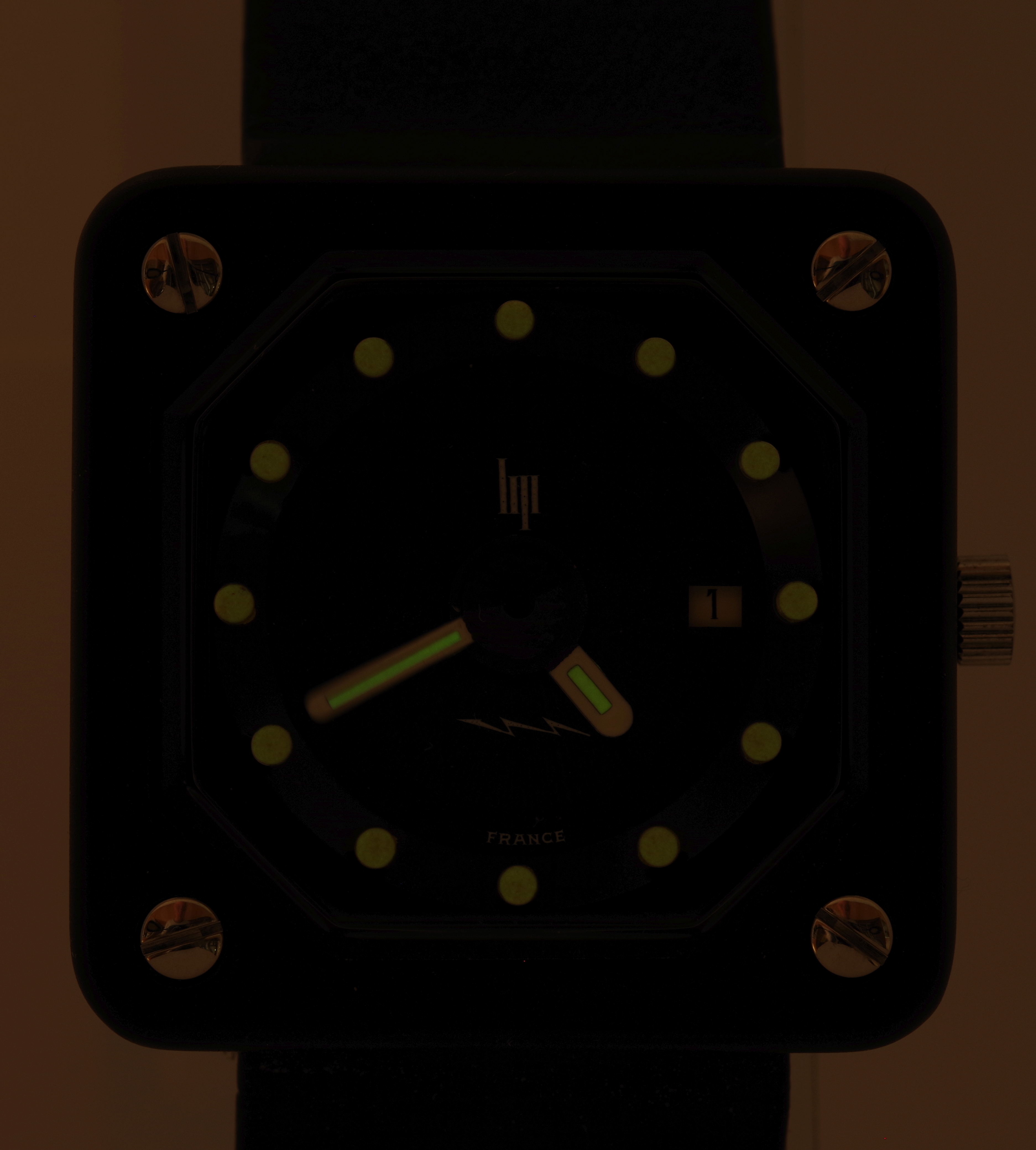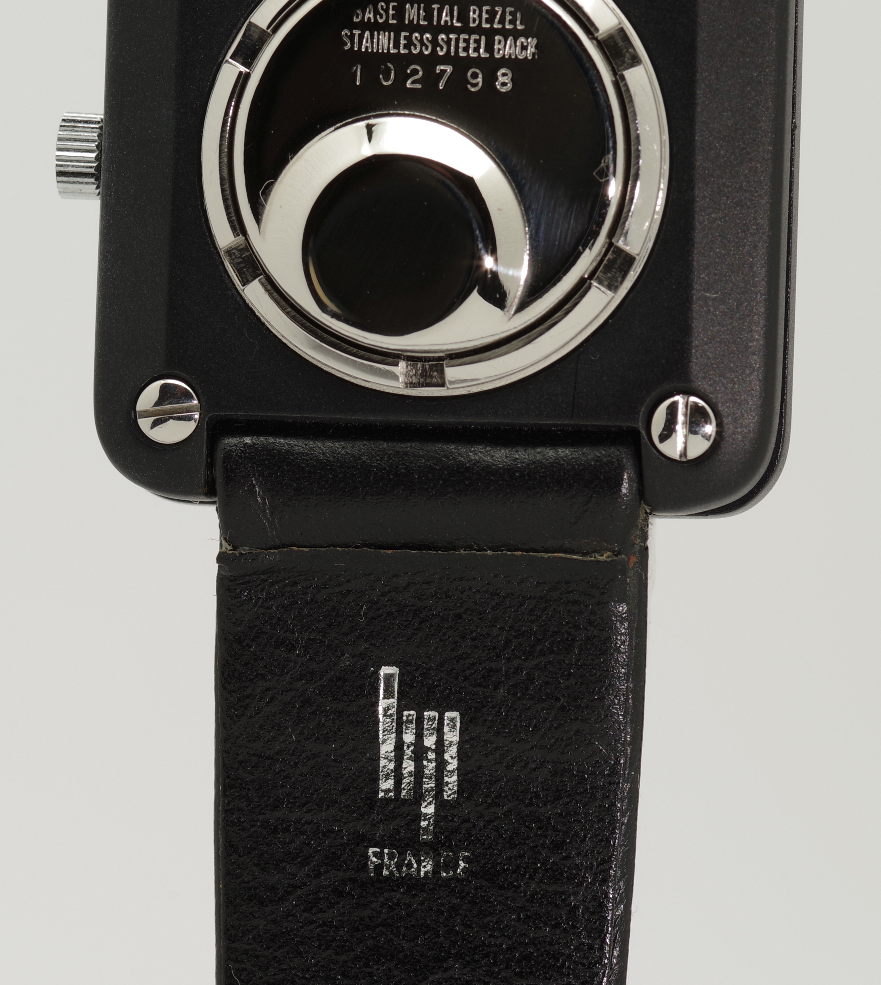 Die Abmaße der Uhr sind 32 x 32 mm, der Bandanstoß hat eine Weite von 20 mm. Das zweiteilige, originale und zu dieser Uhr gehörende LIP signierte schwarze Armband hat eine Länge von 11,5 cm und 7,0 cm und erscheint neuwertig und in einem sehr gut tragbaren Zustand zu sein.