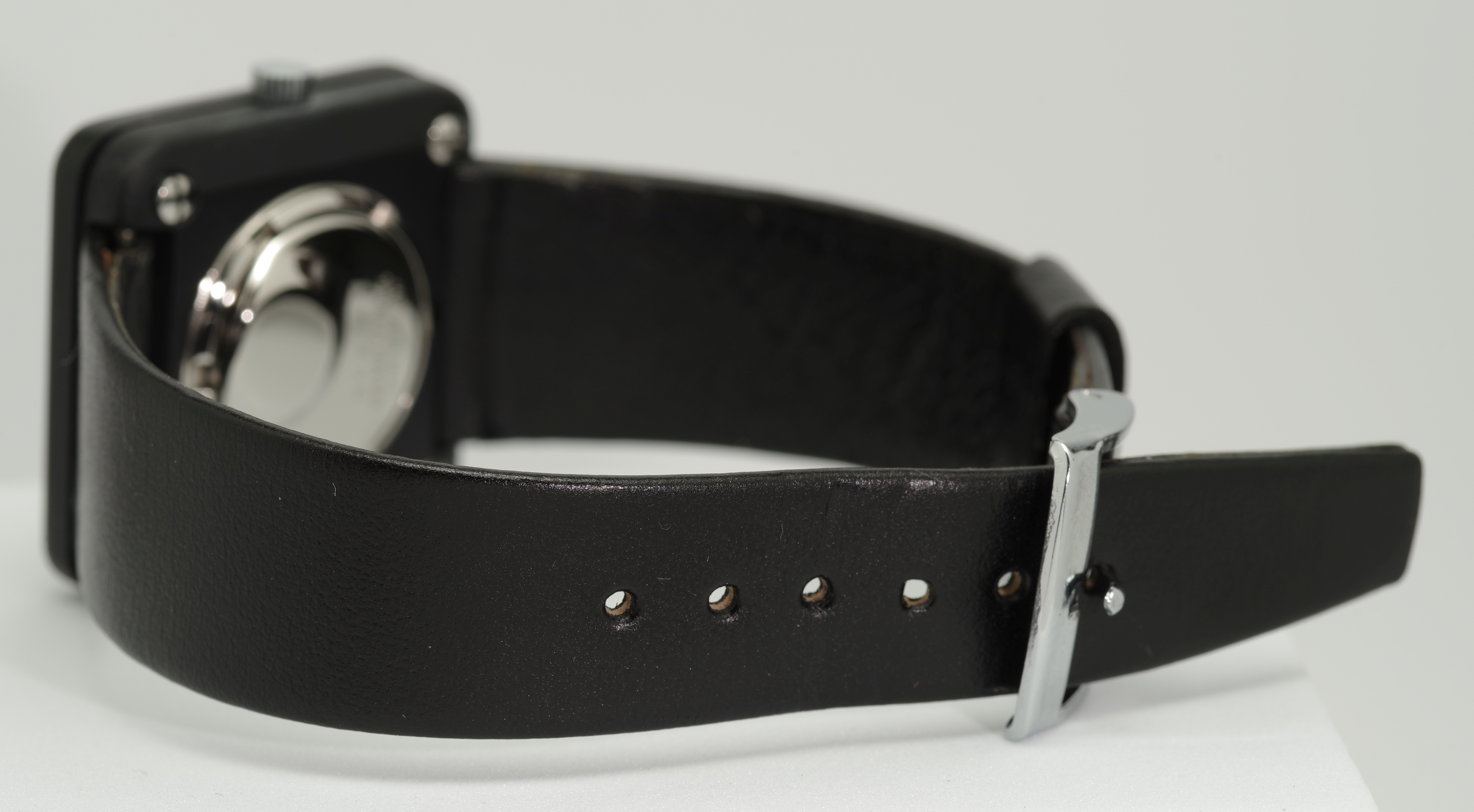 Insgesamt besteht diese Reihe aus vier Modellen. Dieses Modell mit der Referenz-Nummer 43842 ist die Variante mit leuchtenden Punkt-Indexes und Leucht-Zeigern auf schwarzem Zifferblatt und schwarzem Gehäuse. Die Leuchtmasse befindet sich im Originalzustand. Ein Nachleuchten ist noch gegeben (siehe Foto), wenn auch nur kurz.