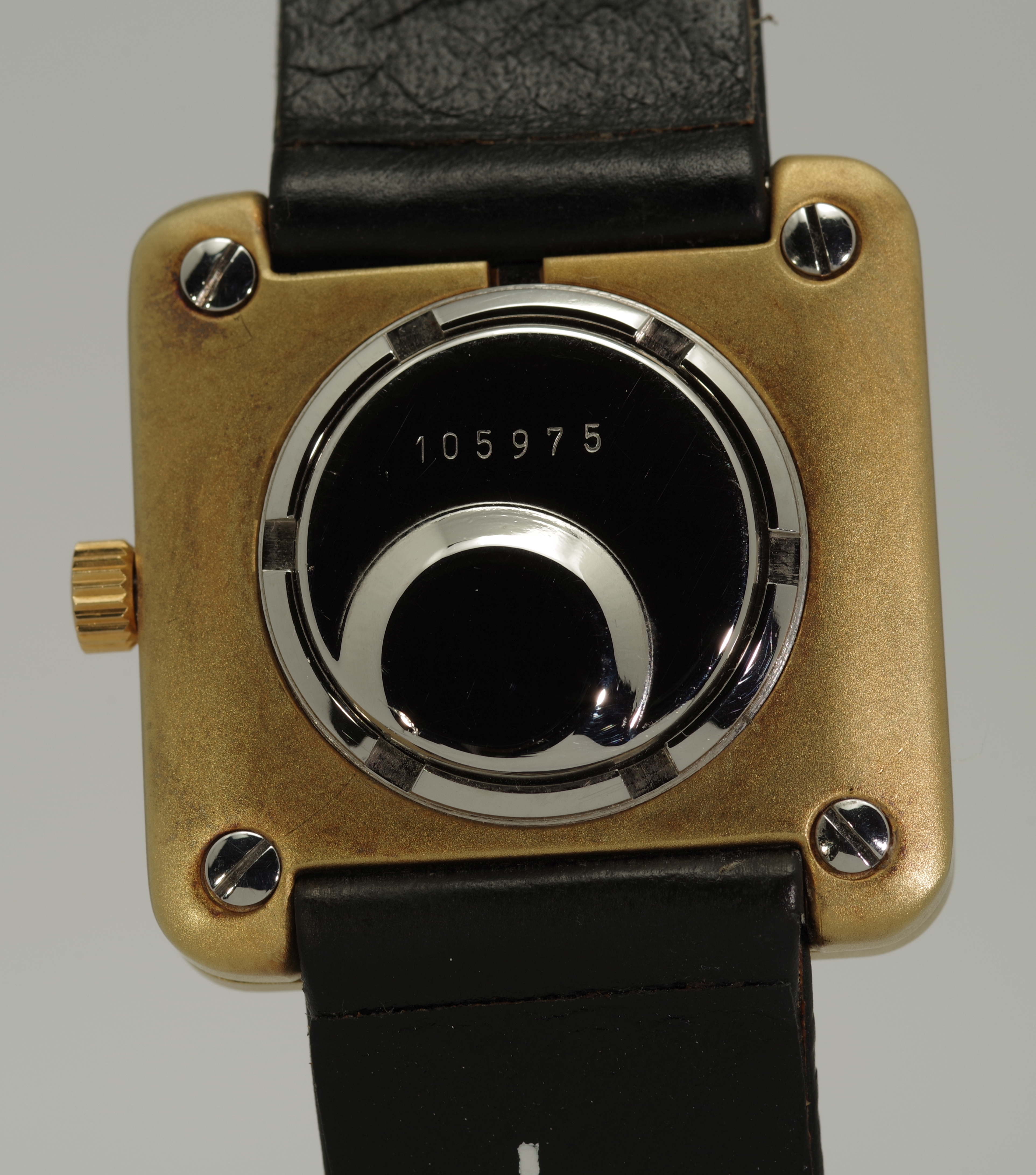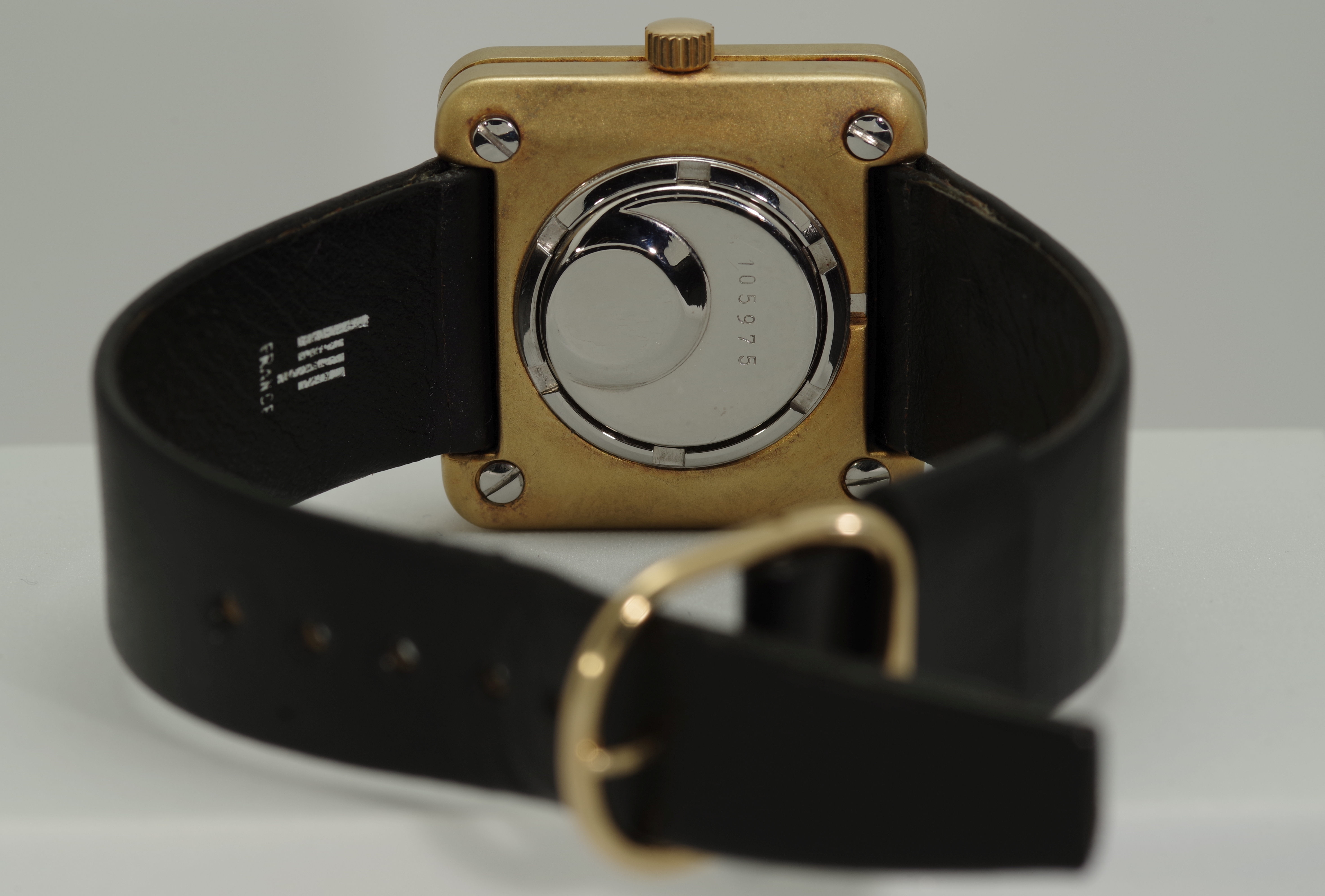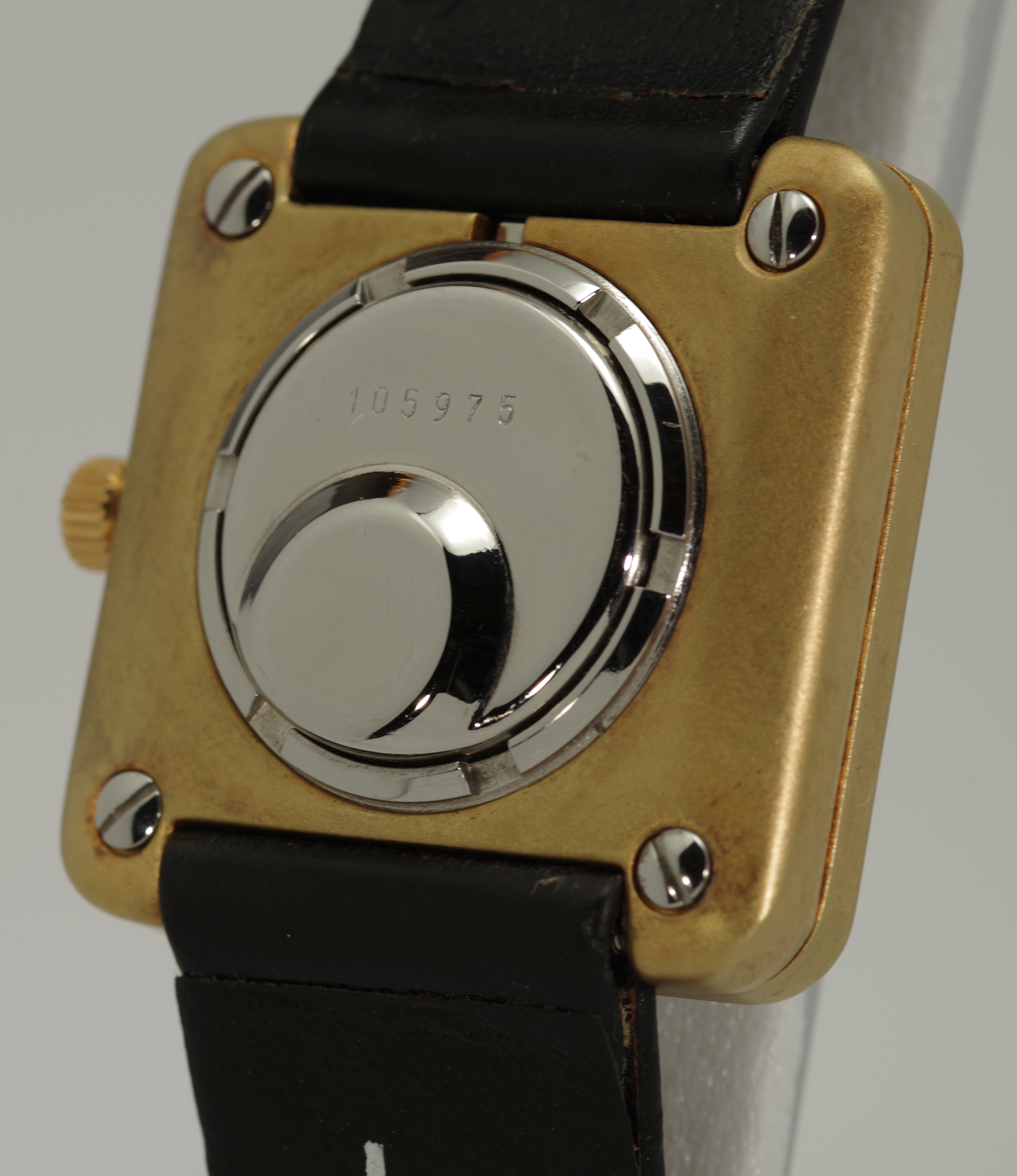 Insgesamt besteht diese Reihe aus vier Modellen. Dieses Modell mit der Referenz-Nummer 43850 ist die Variante mit einem schwarz/weißem Zifferblatt in einem matt vergoldeten Gehäuse und dem weißen Sekundenzeiger.