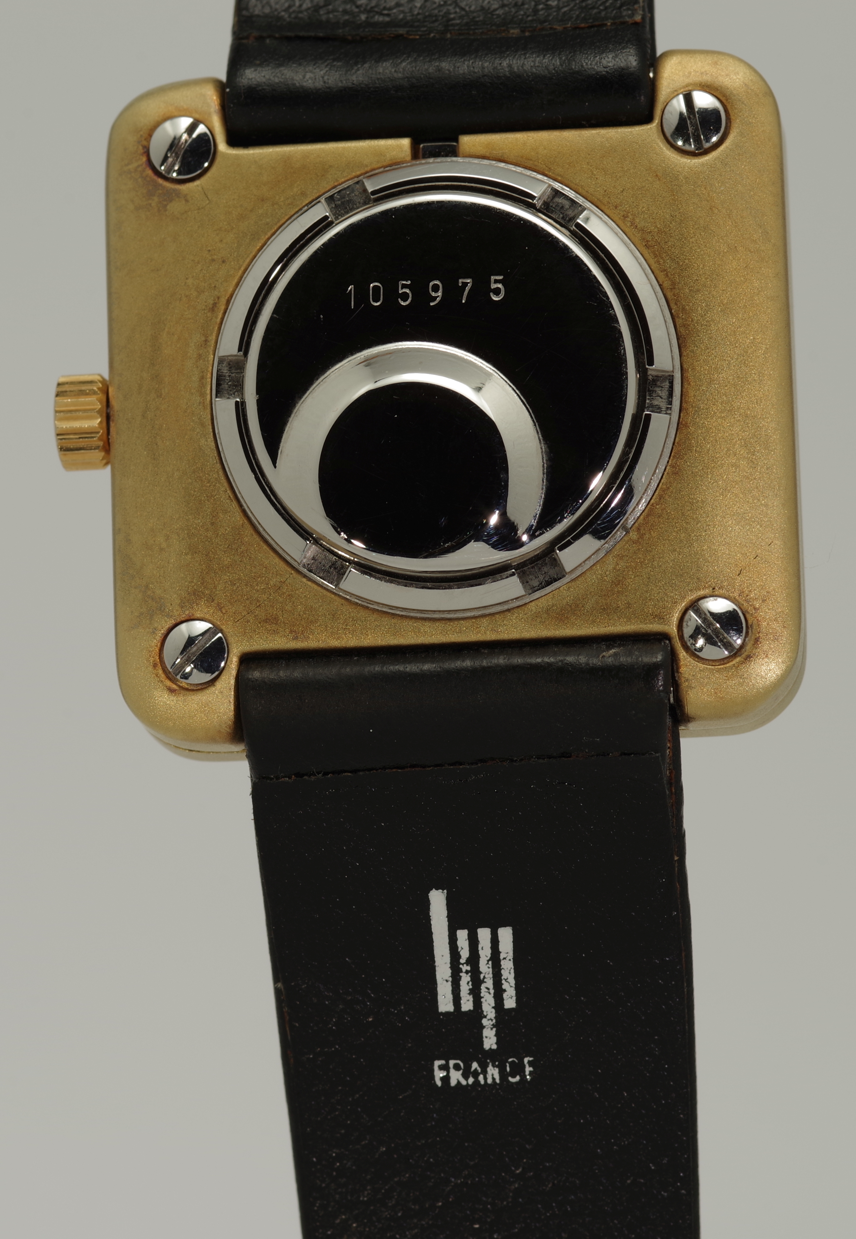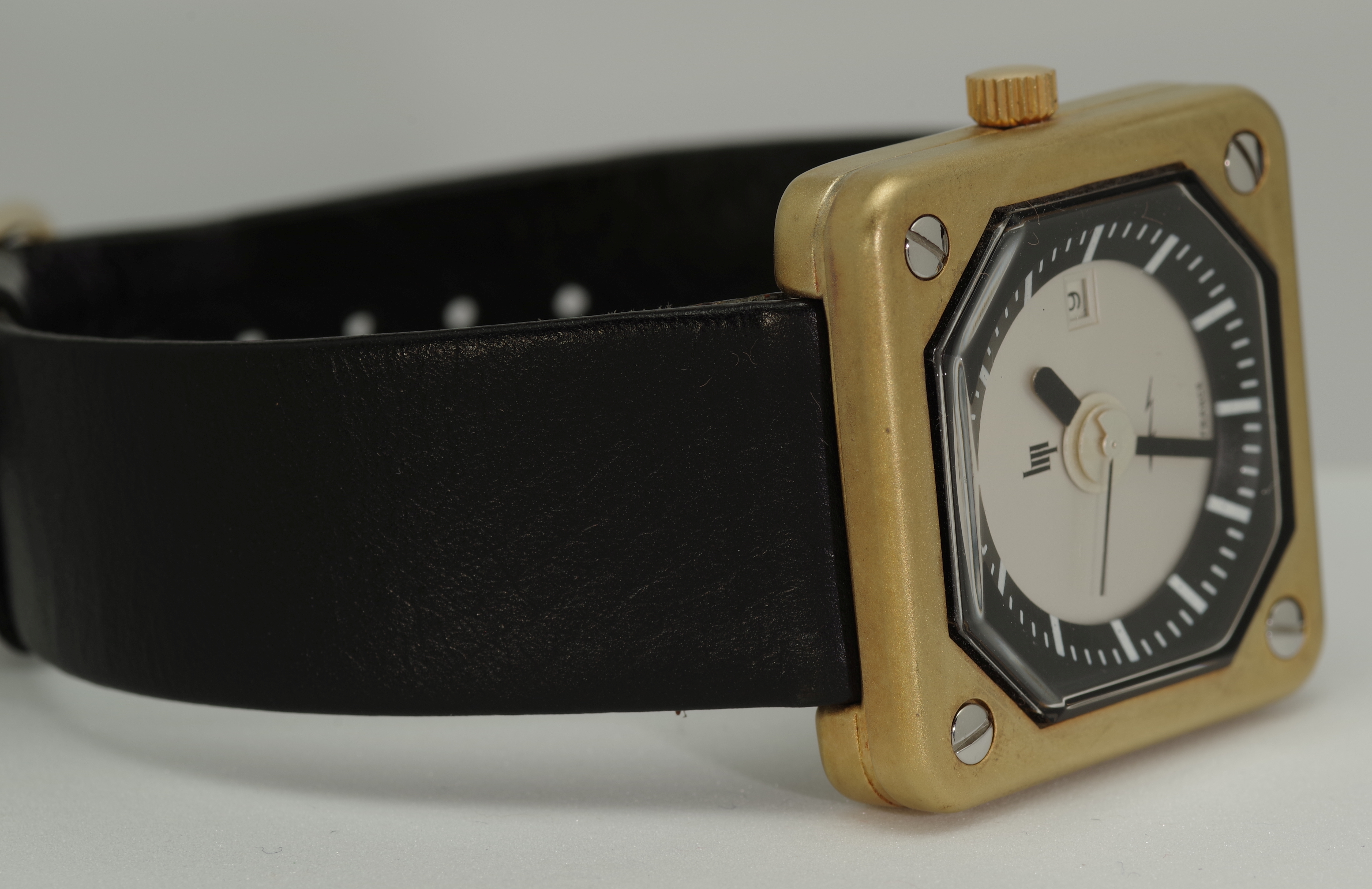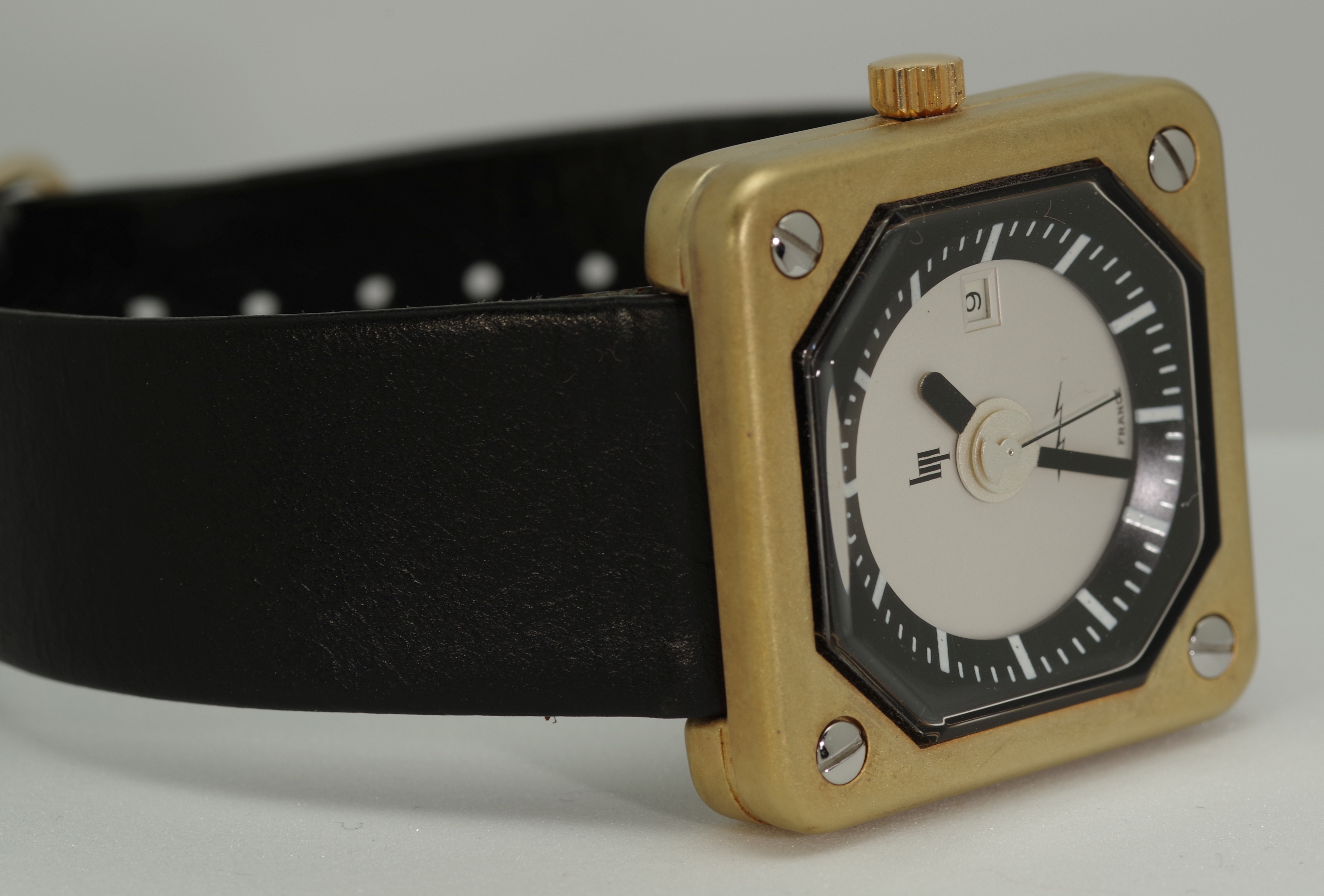 Im Verkauf befindet sich als Rarität diese Herren-Armbanduhr des französischen Uhrenherstellers LIP aus den 1975-er Jahren in vergleichsweise vorzüglicher Luxus-Erhaltung und in absolut sammelwürdigem Zustand. Diese einzigartige Modellreihe wurde vom Schweizer Designer Rudi Meyer entworfen und liefert die finale, raffinierte Version dessen, was eine schöne Formuhr für einen Industriegrafikdesigner bedeutet.