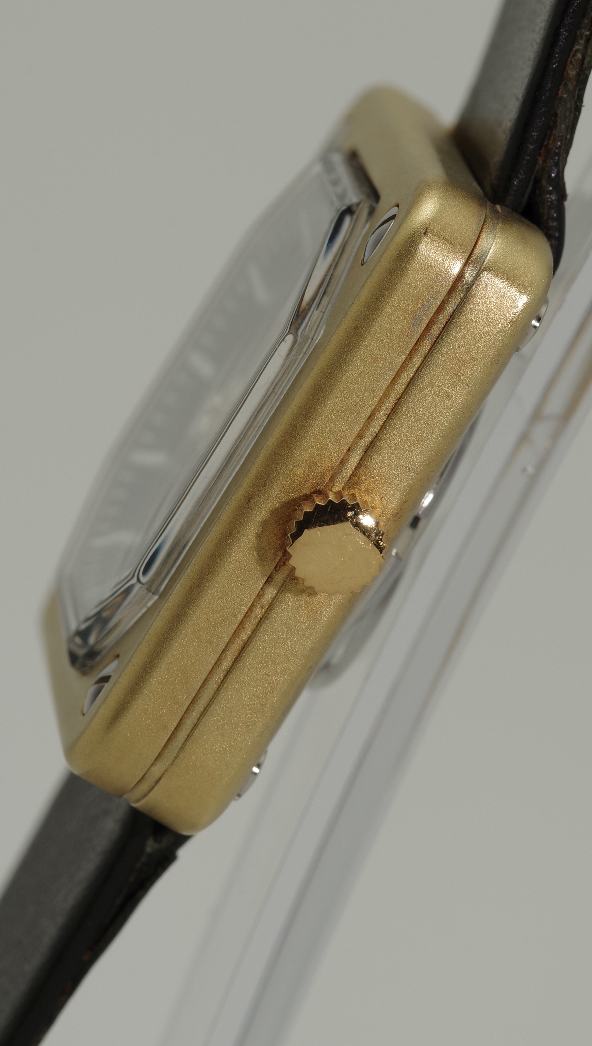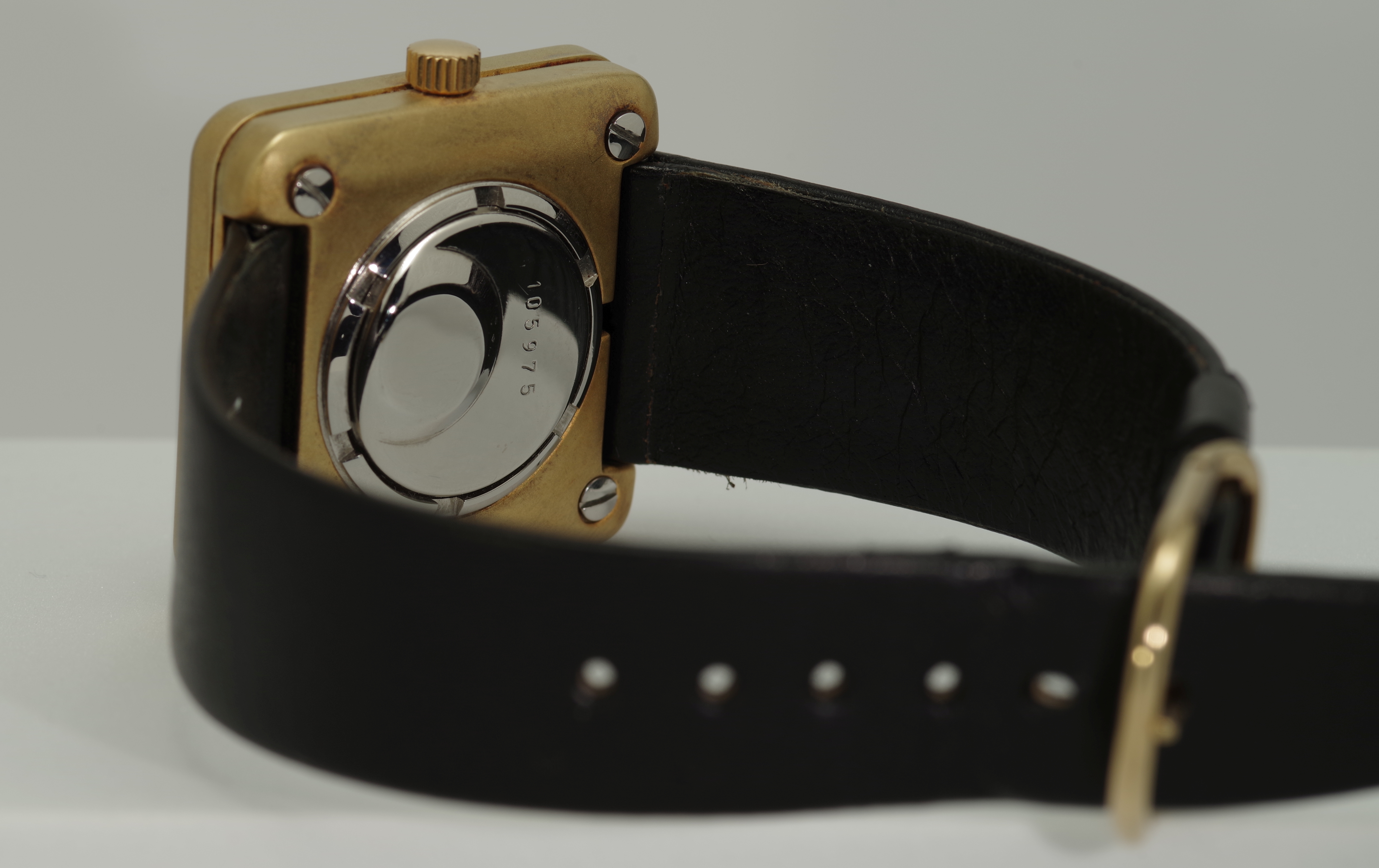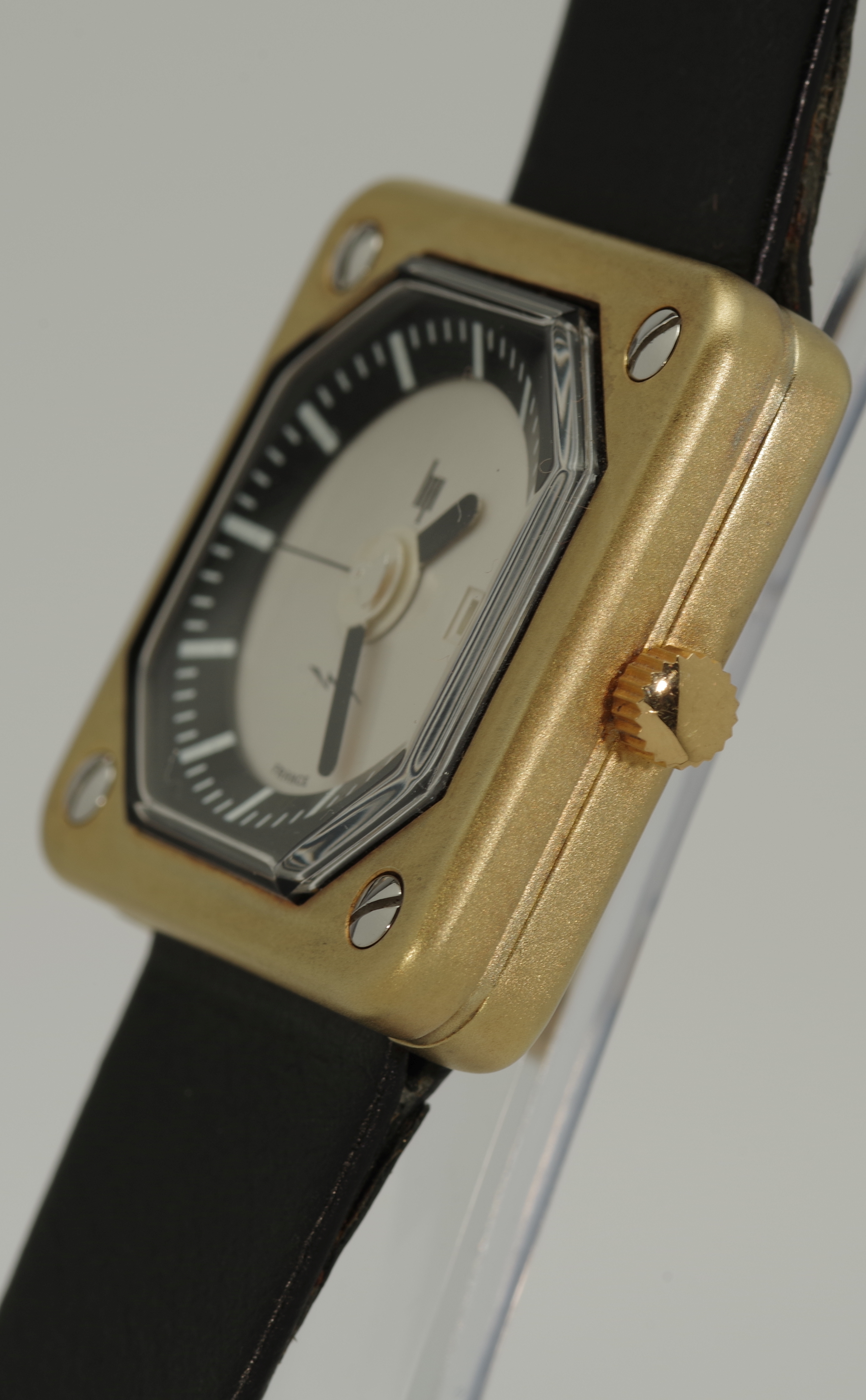Im Verkauf befindet sich als Rarität diese Herren-Armbanduhr des französischen Uhrenherstellers LIP aus den 1975-er Jahren in vergleichsweise vorzüglicher Luxus-Erhaltung und in absolut sammelwürdigem Zustand. Diese einzigartige Modellreihe wurde vom Schweizer Designer Rudi Meyer entworfen und liefert die finale, raffinierte Version dessen, was eine schöne Formuhr für einen Industriegrafikdesigner bedeutet.