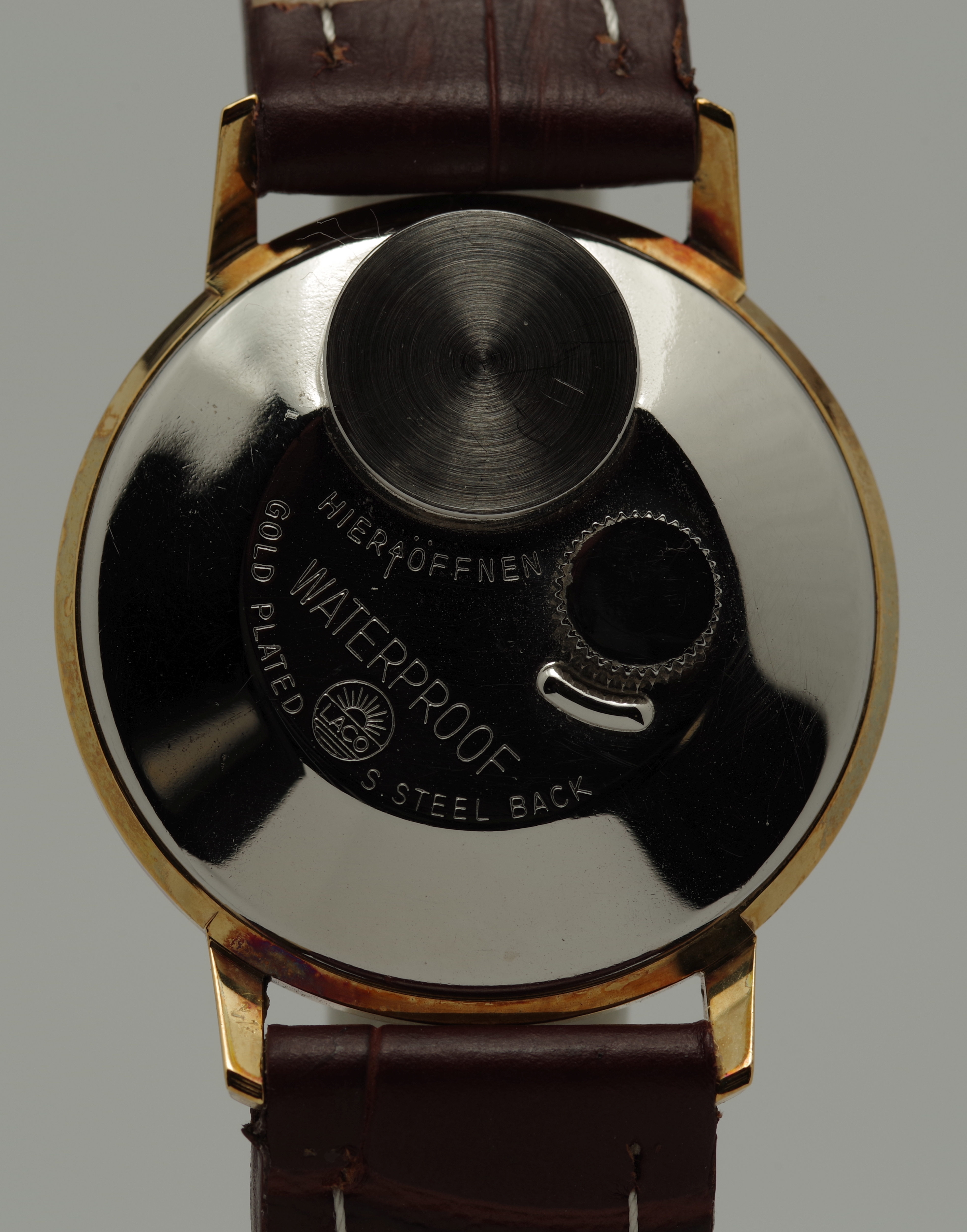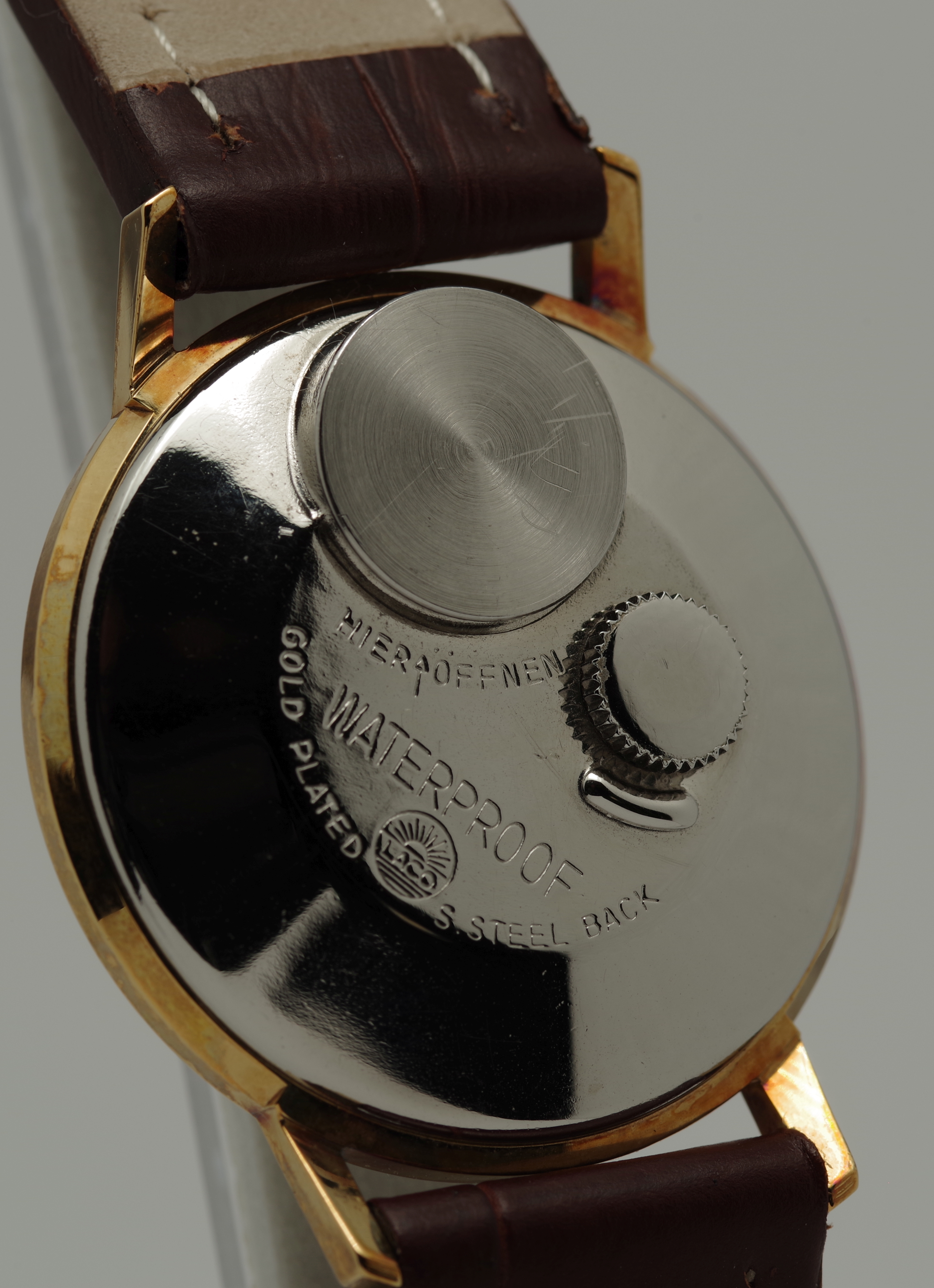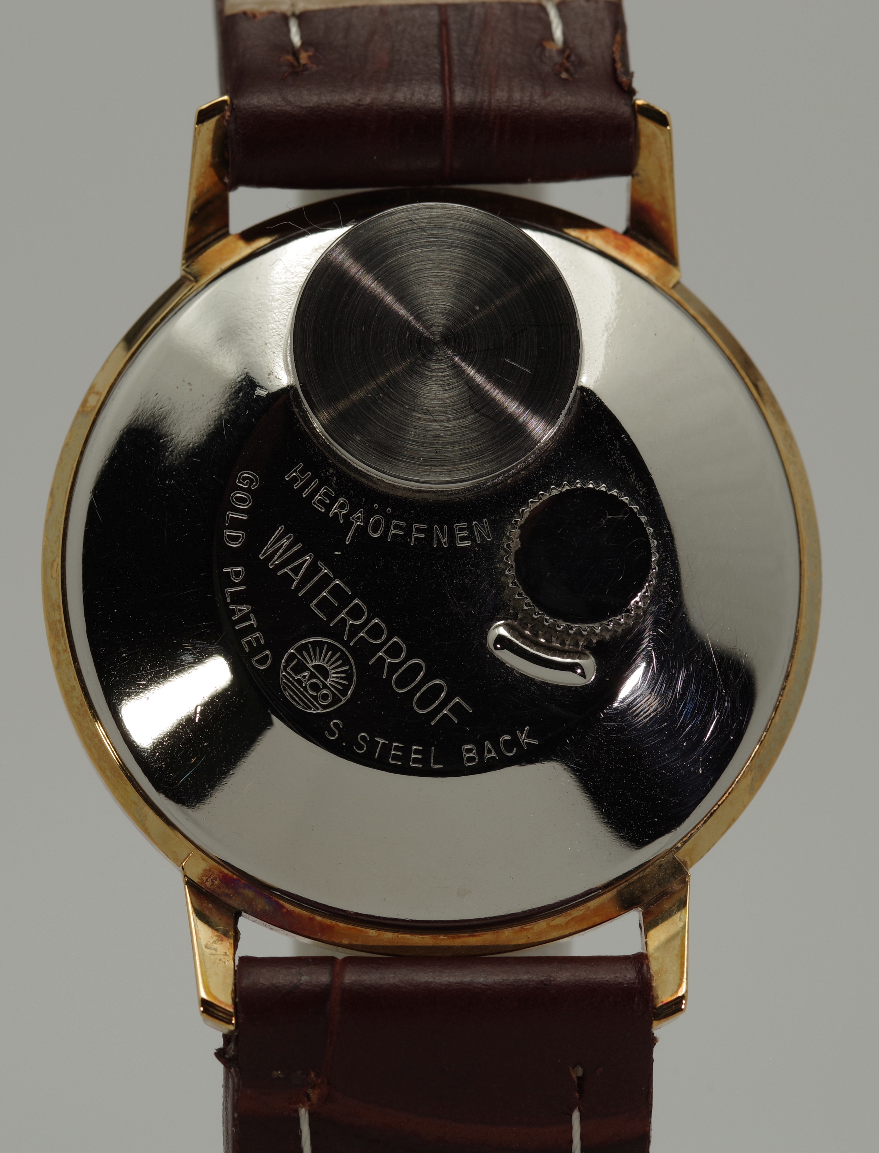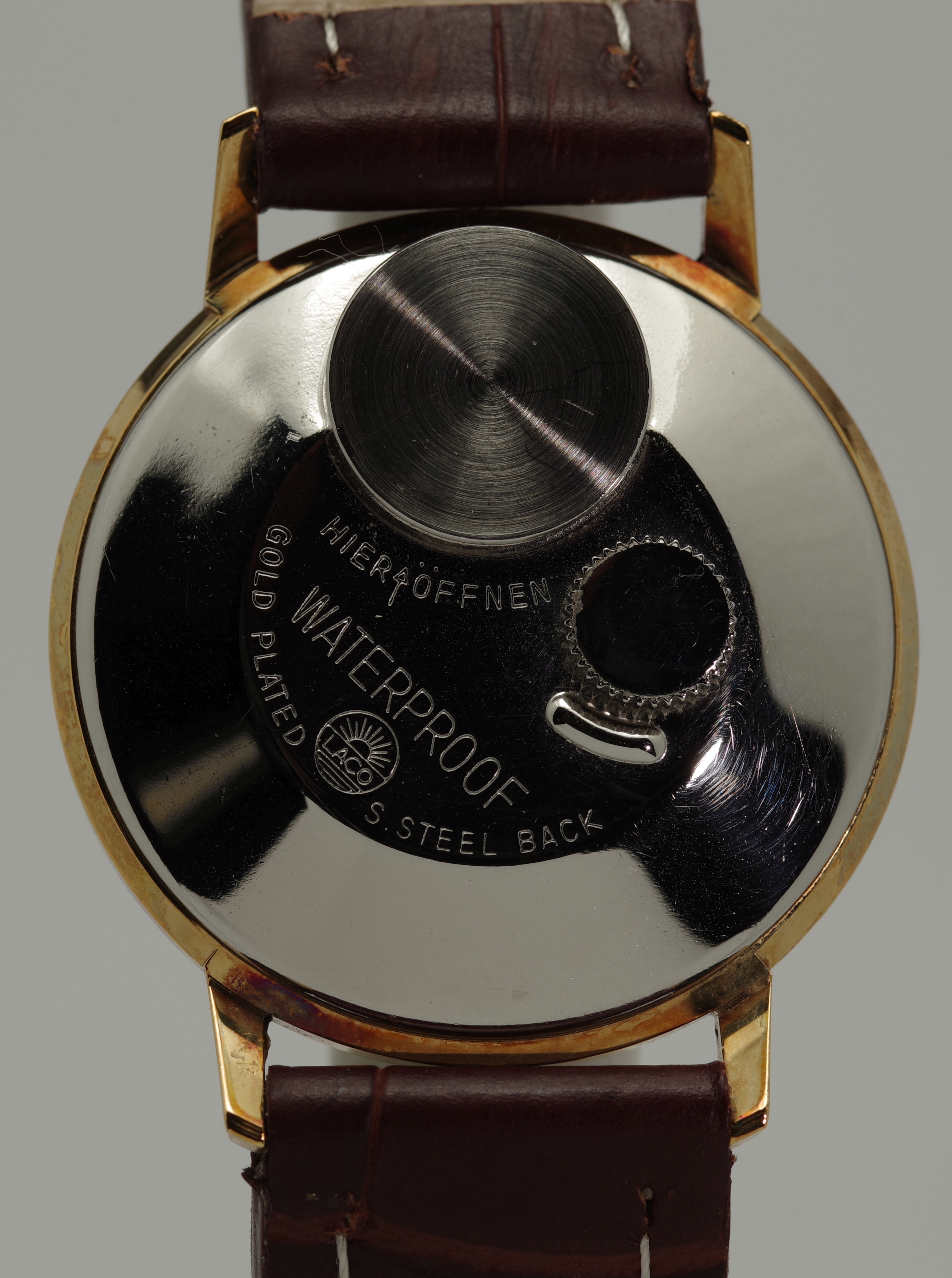 Die Krone befindet sich bei den Laco Electric Modellen auf der Rückseite der Uhr, womit man gelegentlich ins Gespräch kommt.