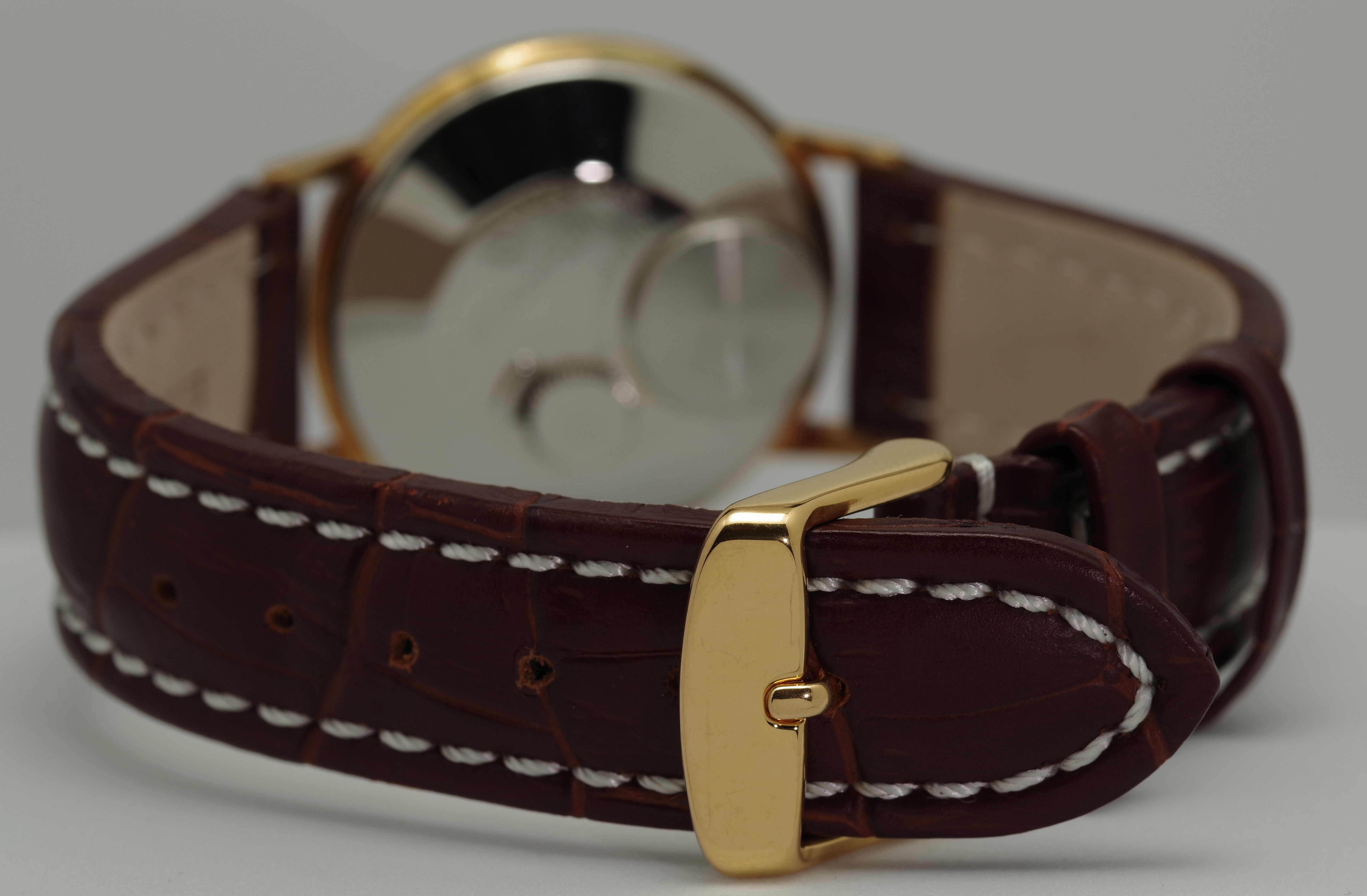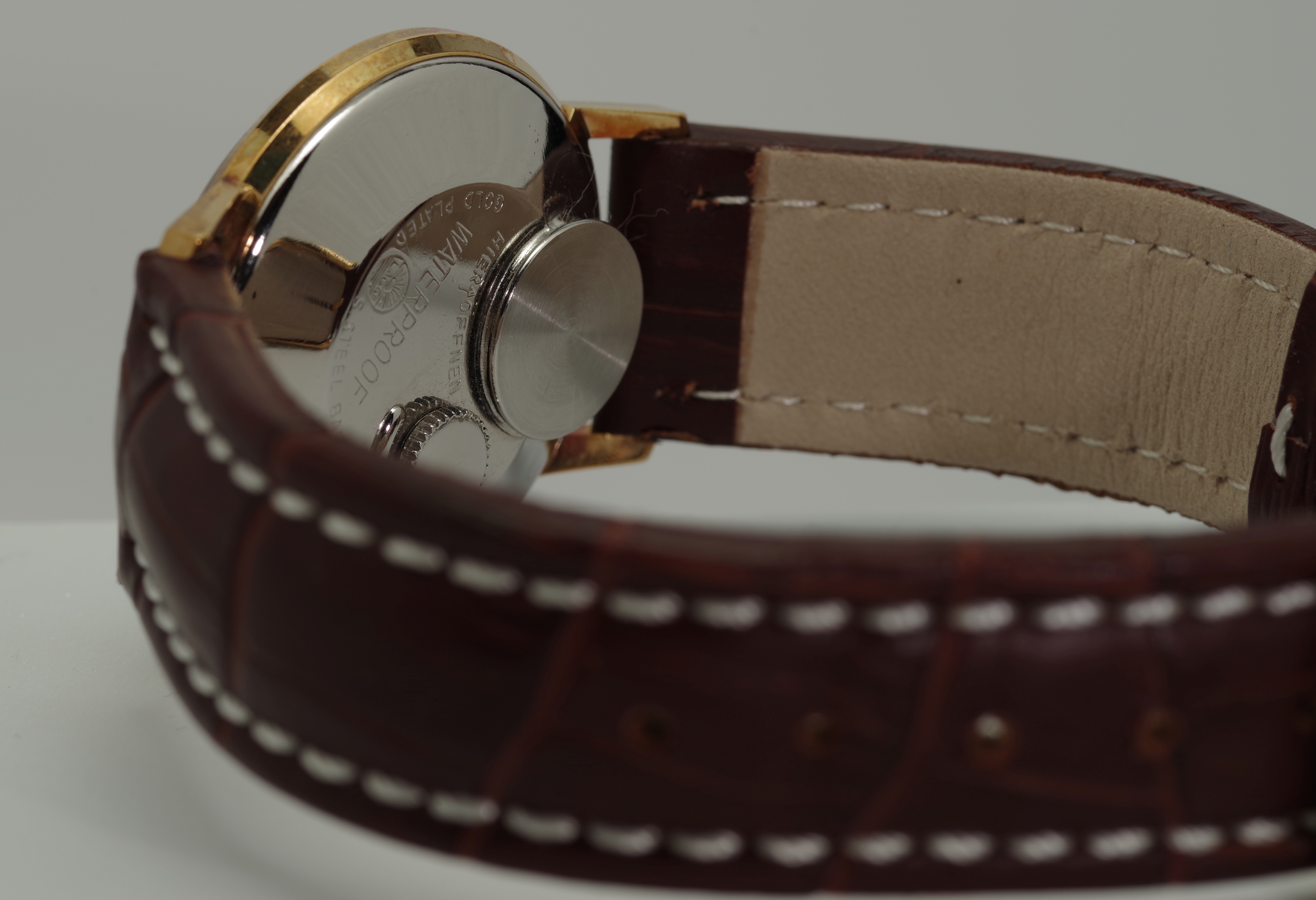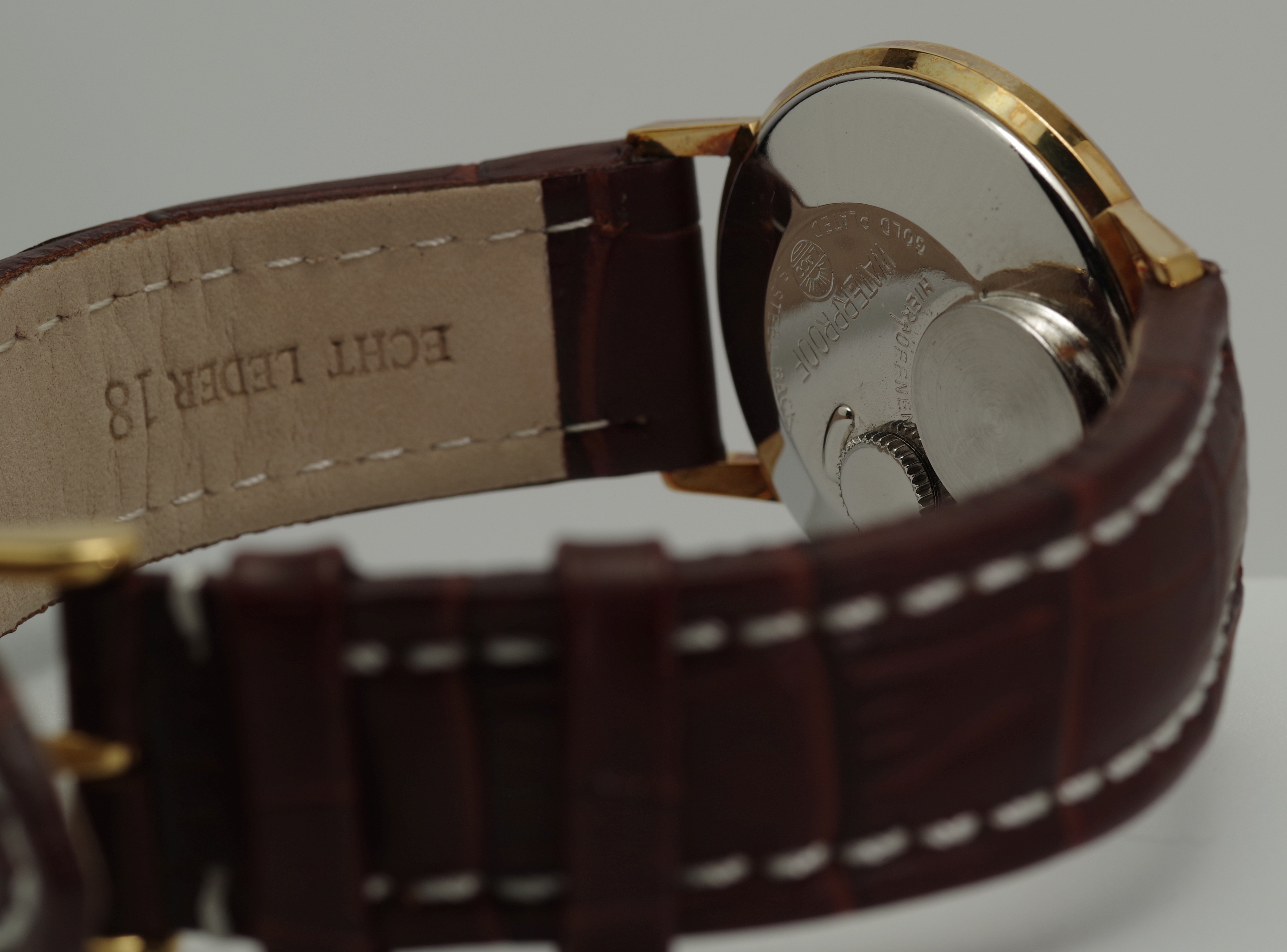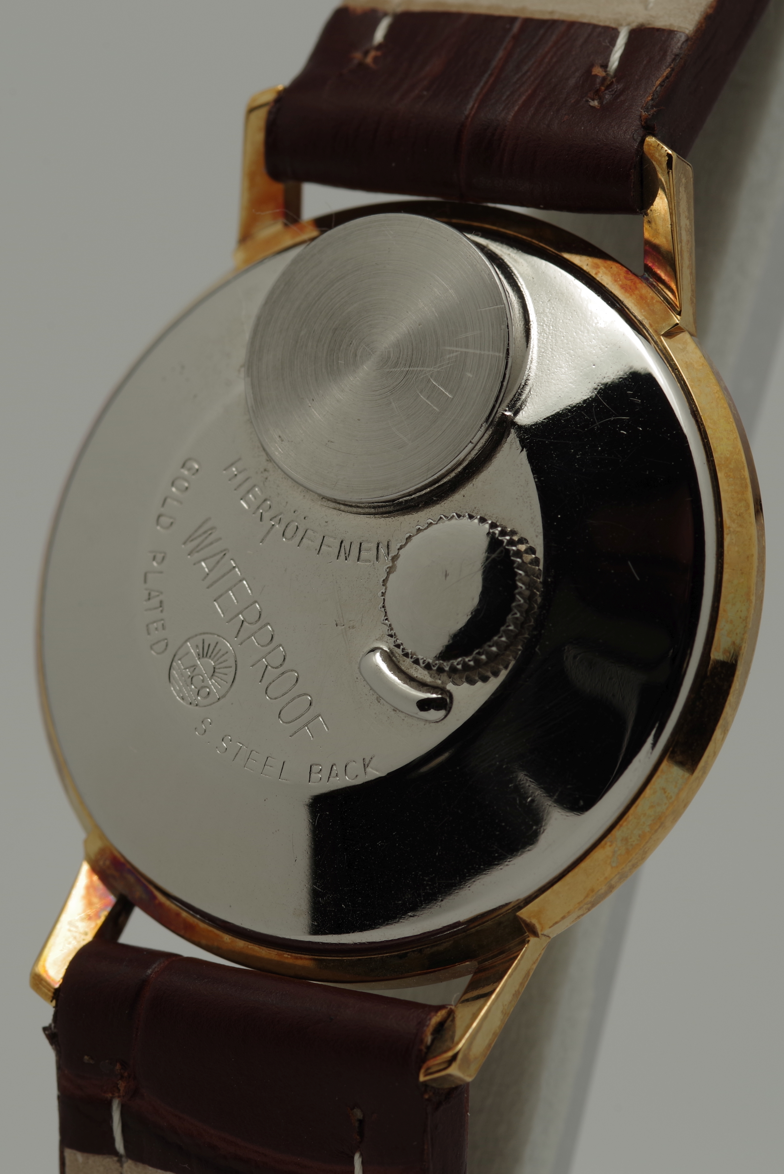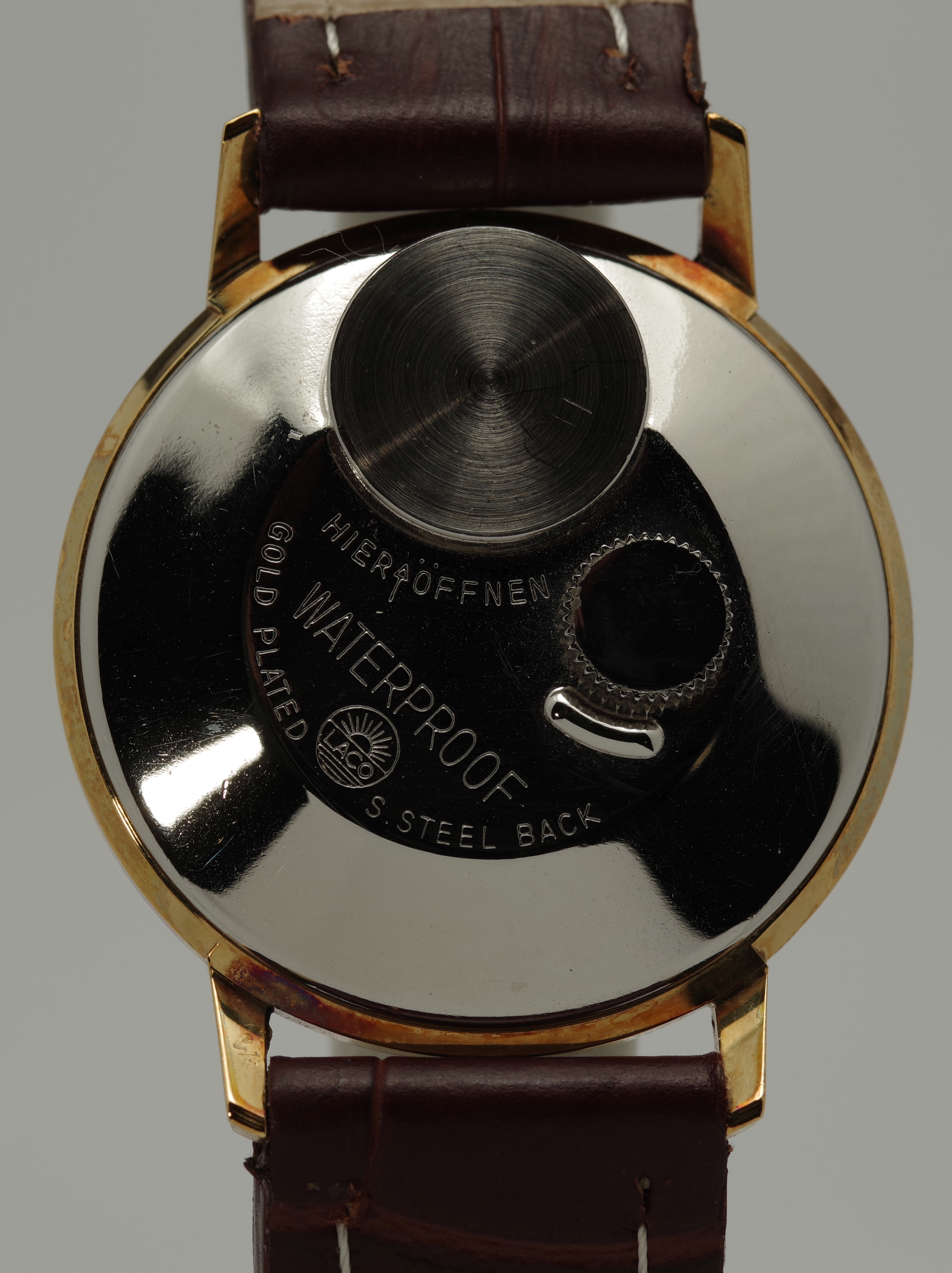 Die Krone befindet sich bei den Laco Electric Modellen auf der Rückseite der Uhr, womit man gelegentlich ins Gespräch kommt.