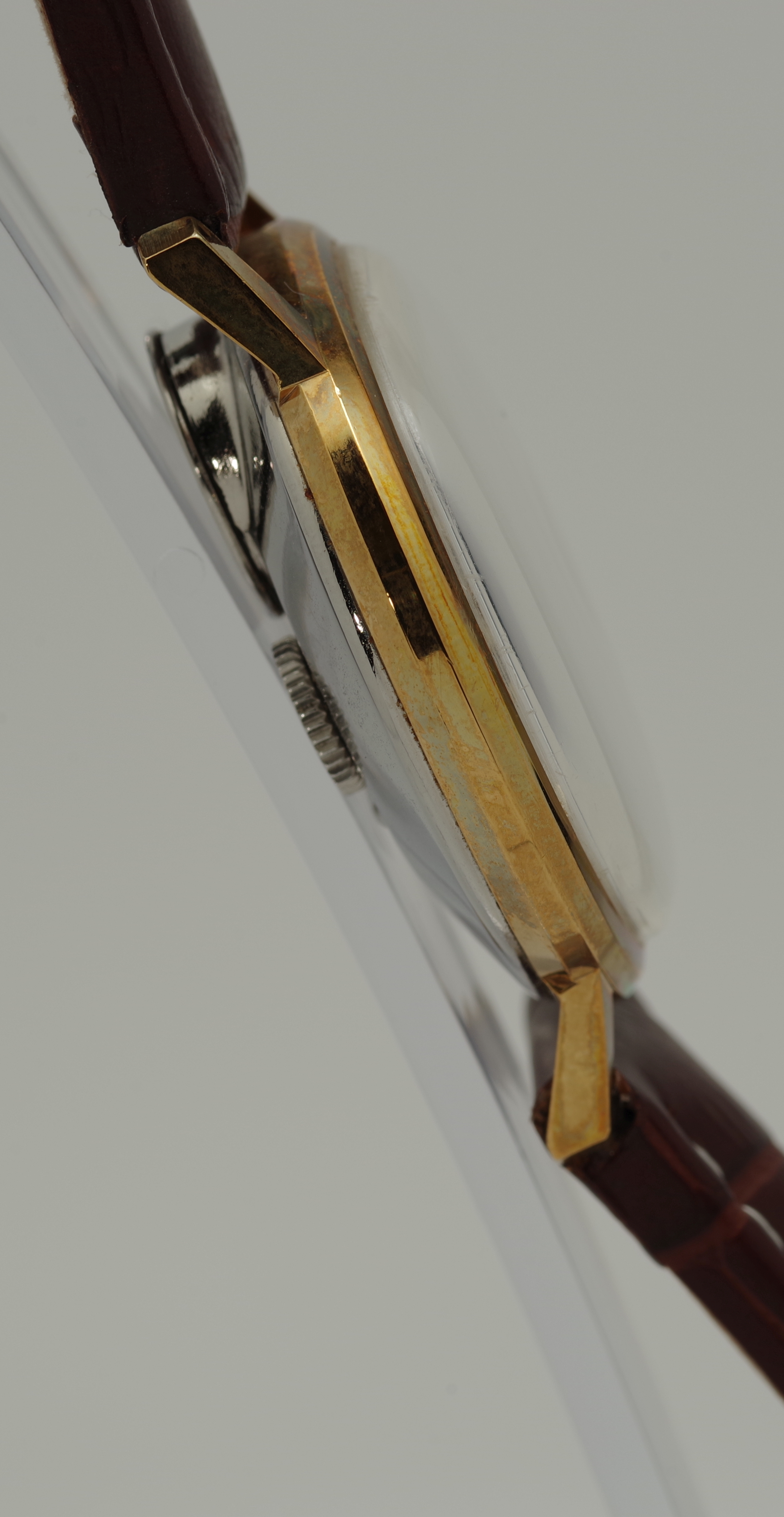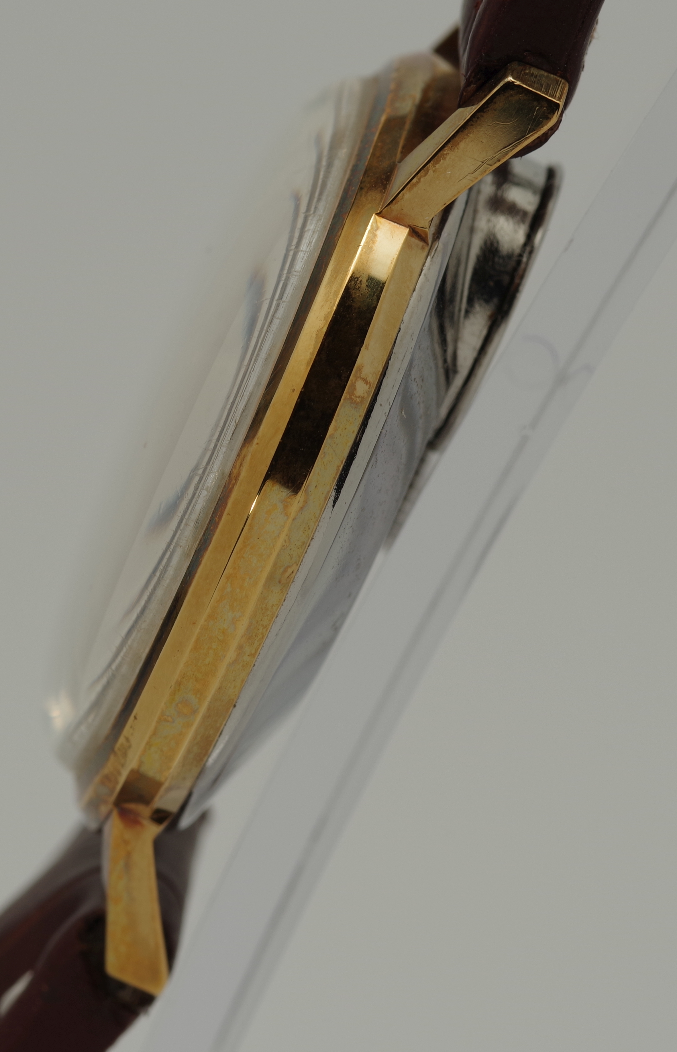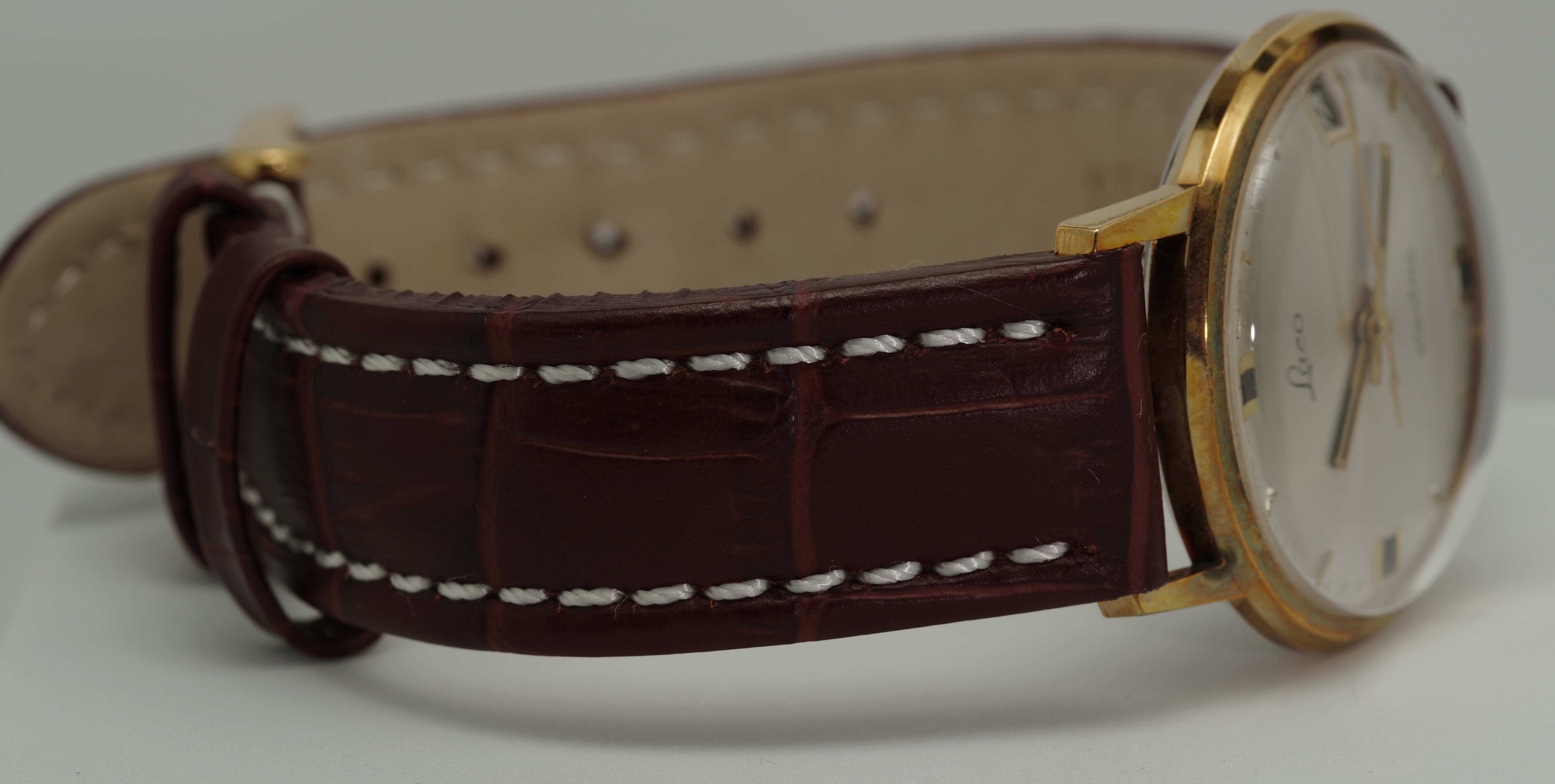 Elegantes vergoldetes Gehäuse, hier vorerst in seinem Zustand belassen. Sie erhalten die Laco selbstverständlich, wie auf dem letzten Foto gezeigt, in geputztem Zustand. Das ist gleichzeitig ein dezenter Hinweis der Leistung von einigen der in unserem Shop erhältlichen Putztücher.