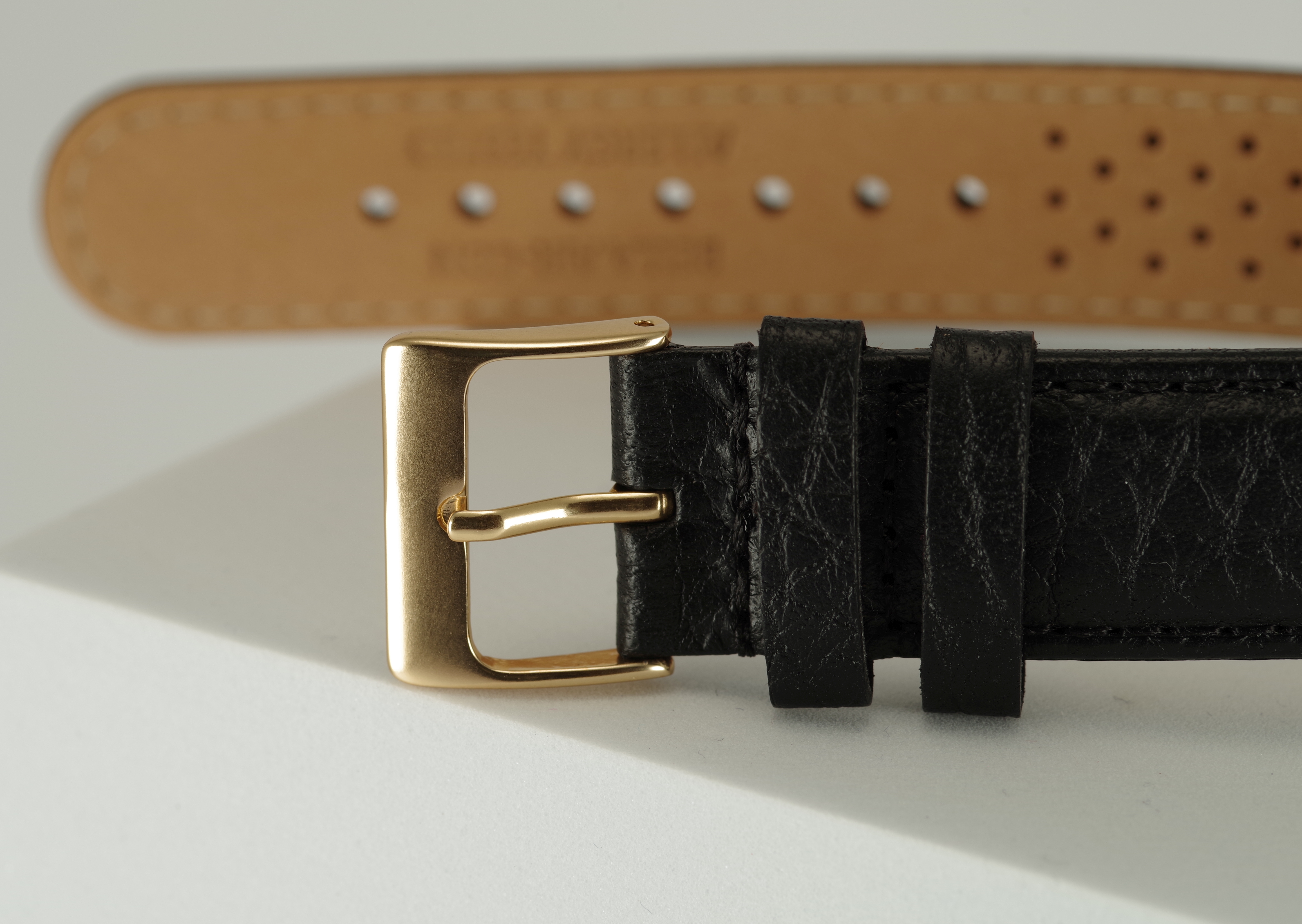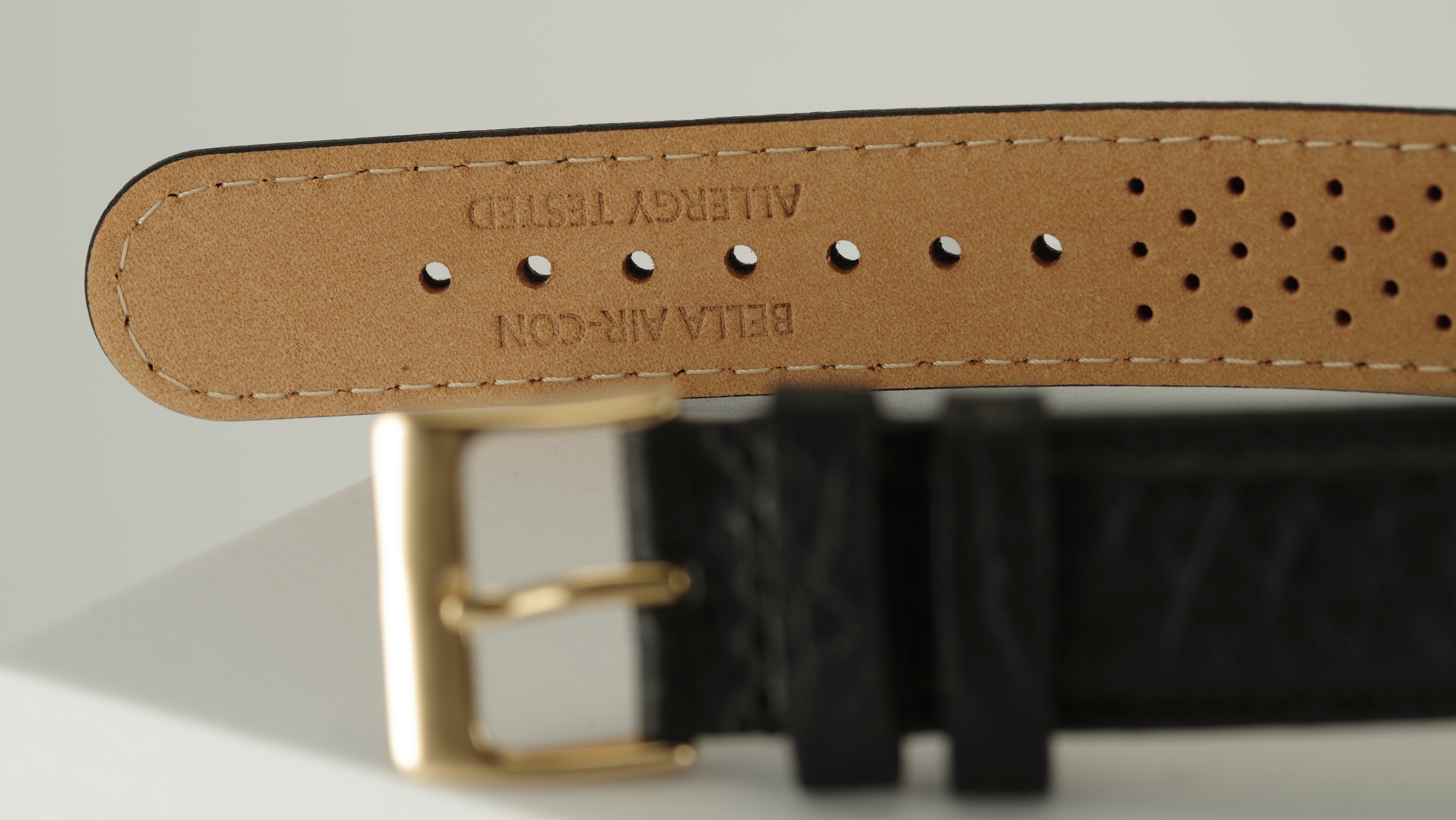 Armband: Schwarzes Kalbslederarmband, ventiliert und antiallergisch für einen Handgelenksumfang zwischen ca. 17 und 21 cm, neu